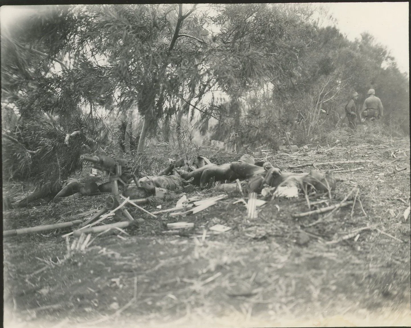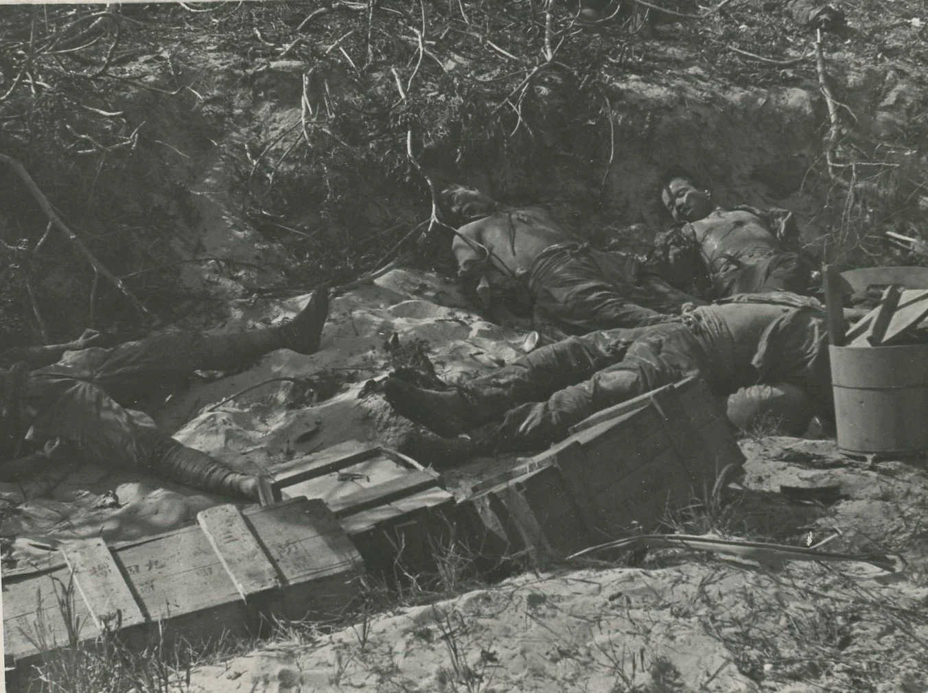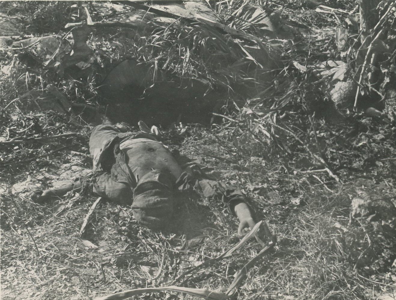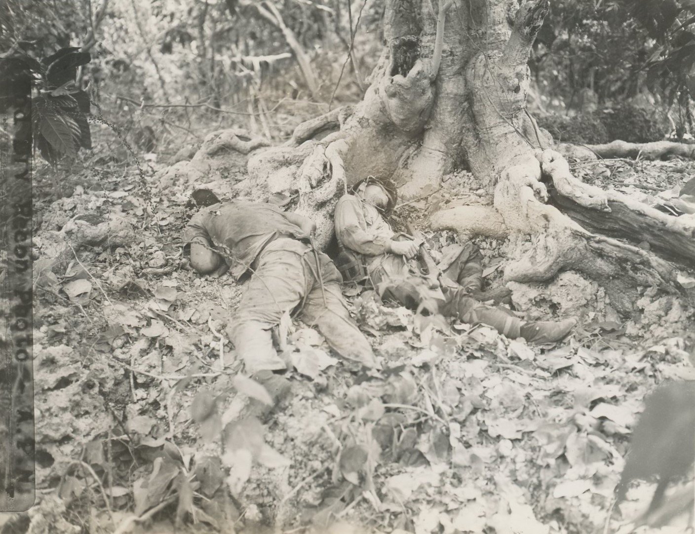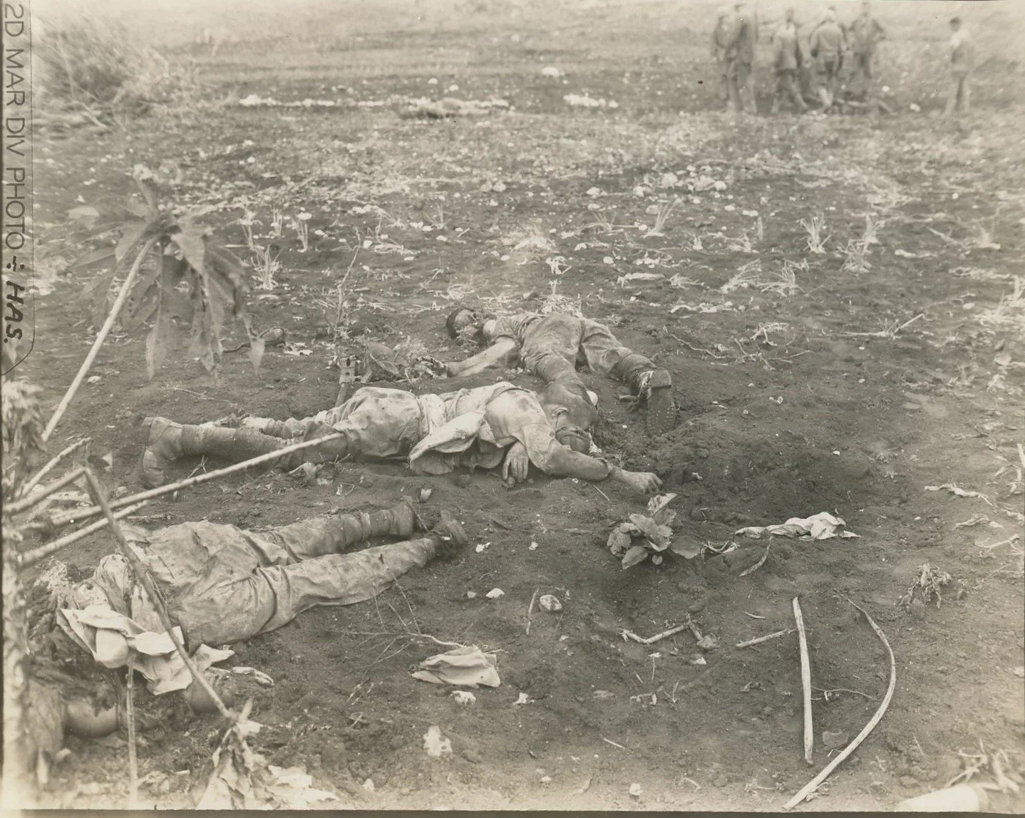 Three Imperial Japanese Army soldiers lie where they were killed.