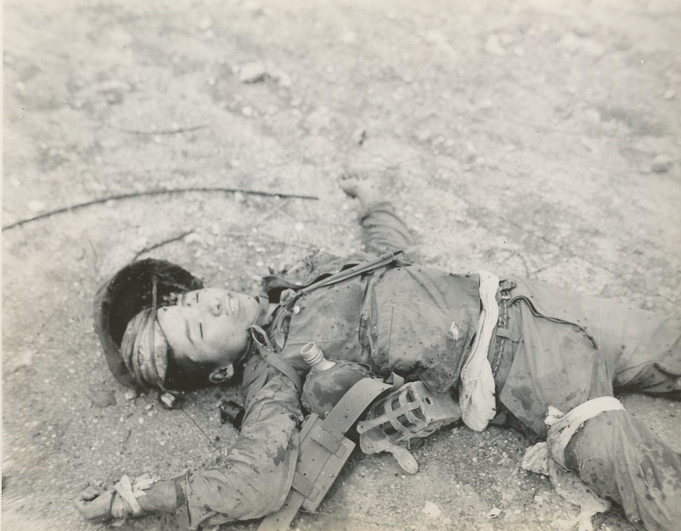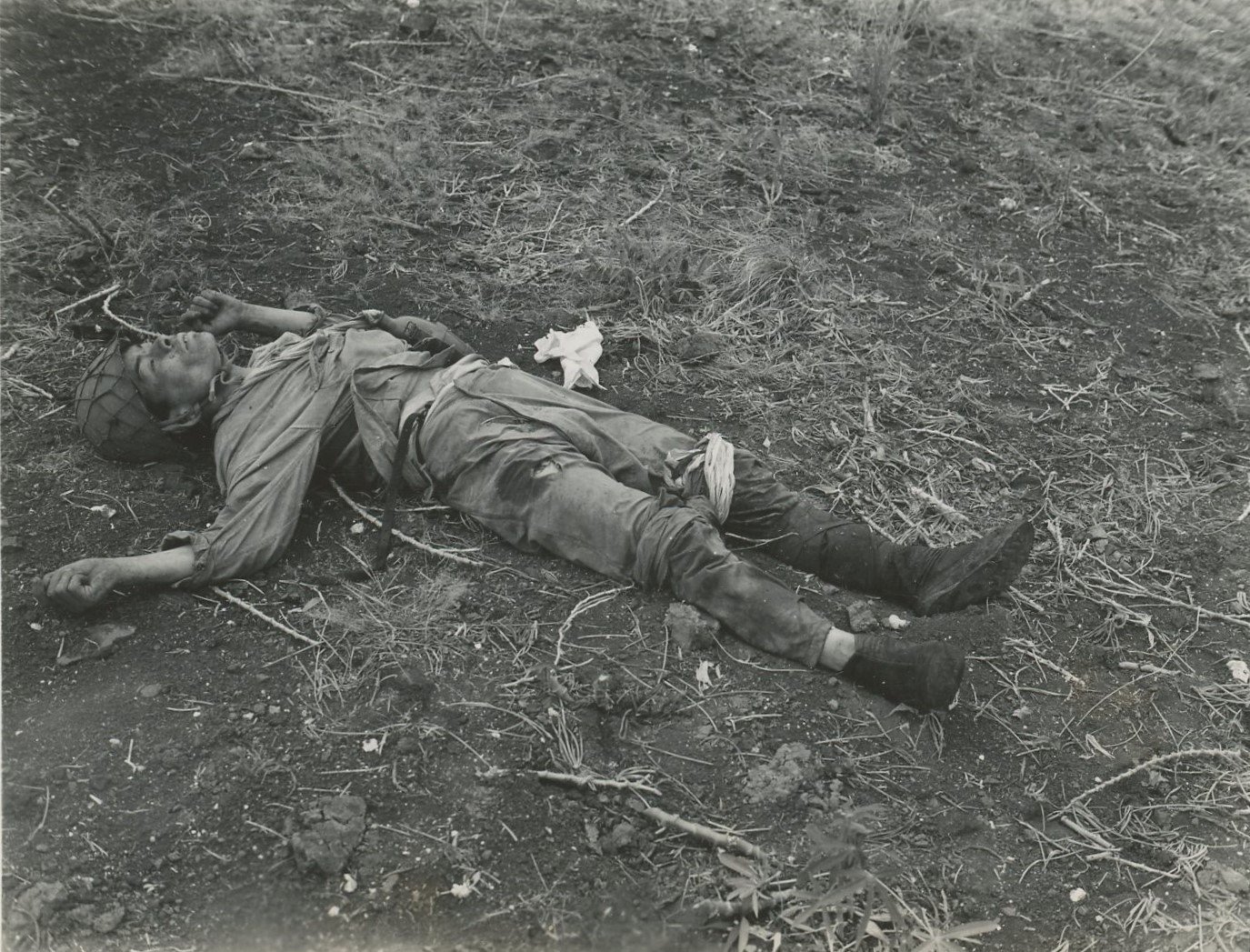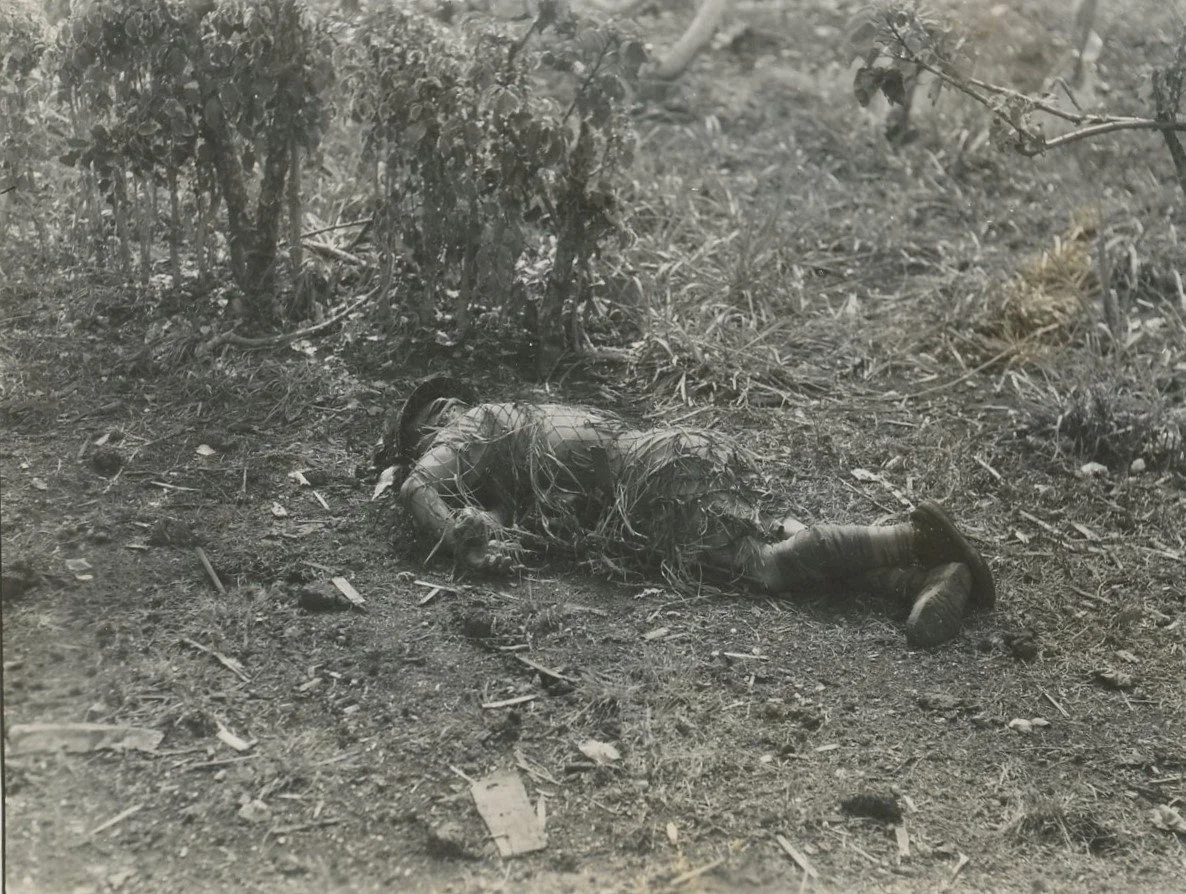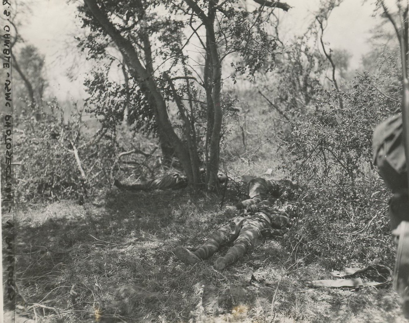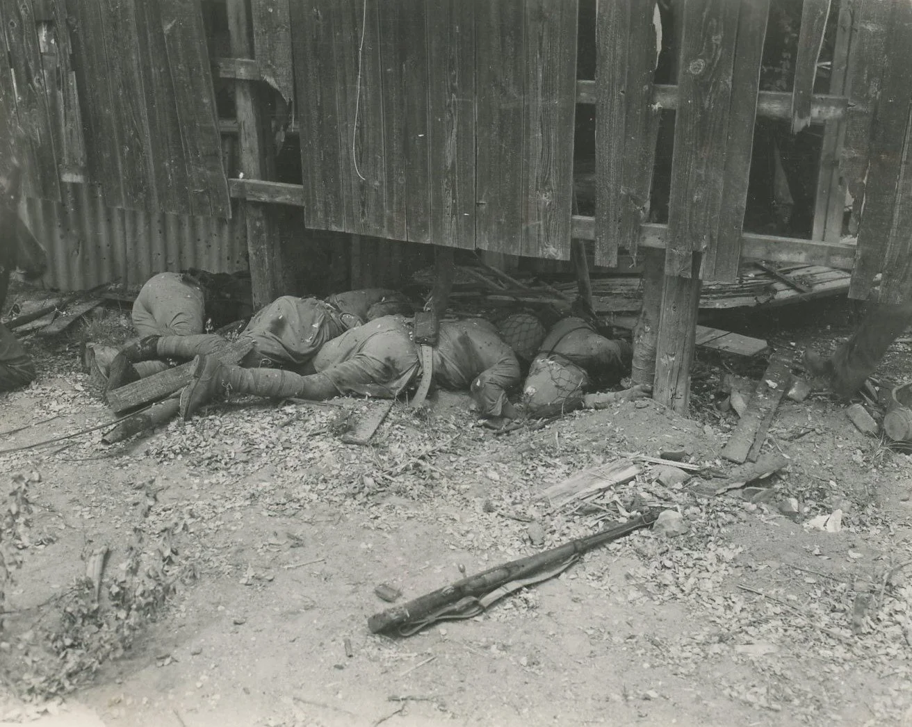 Three Imperial Japanese Army soldiers lie where they were killed.