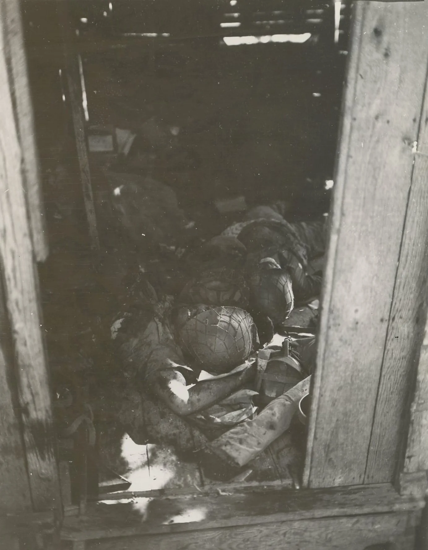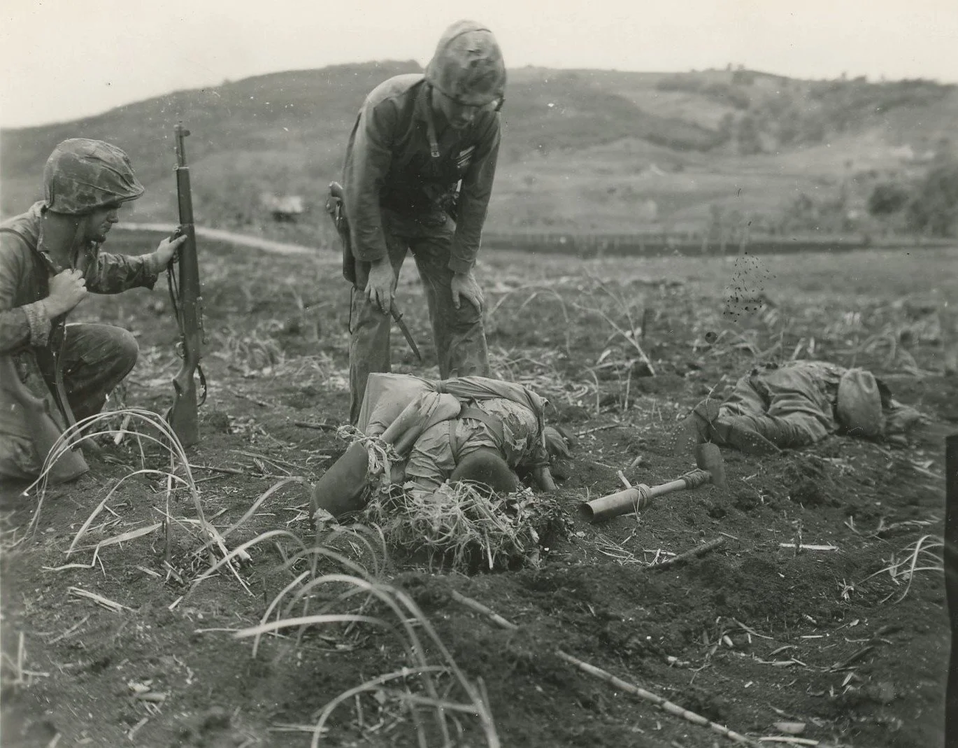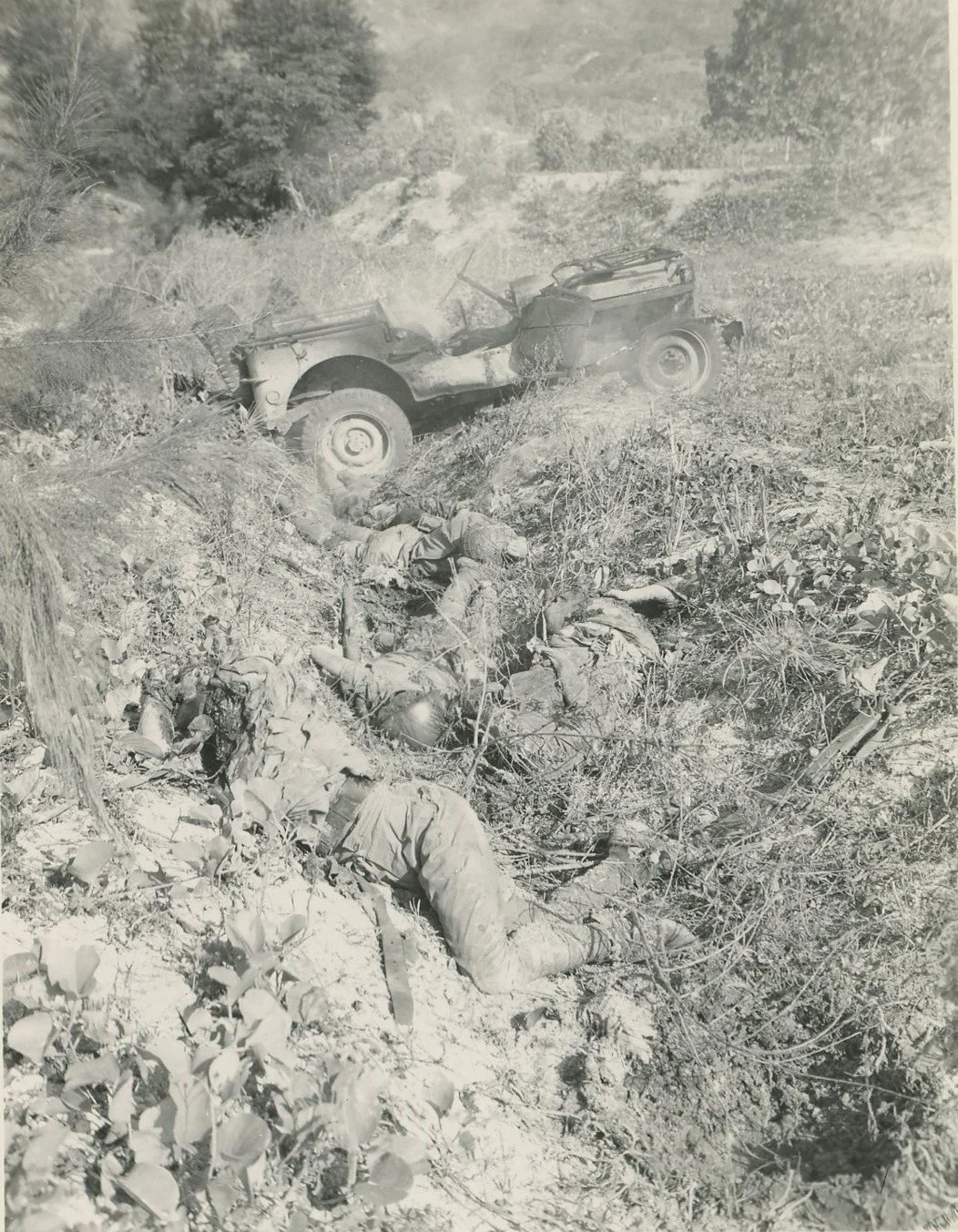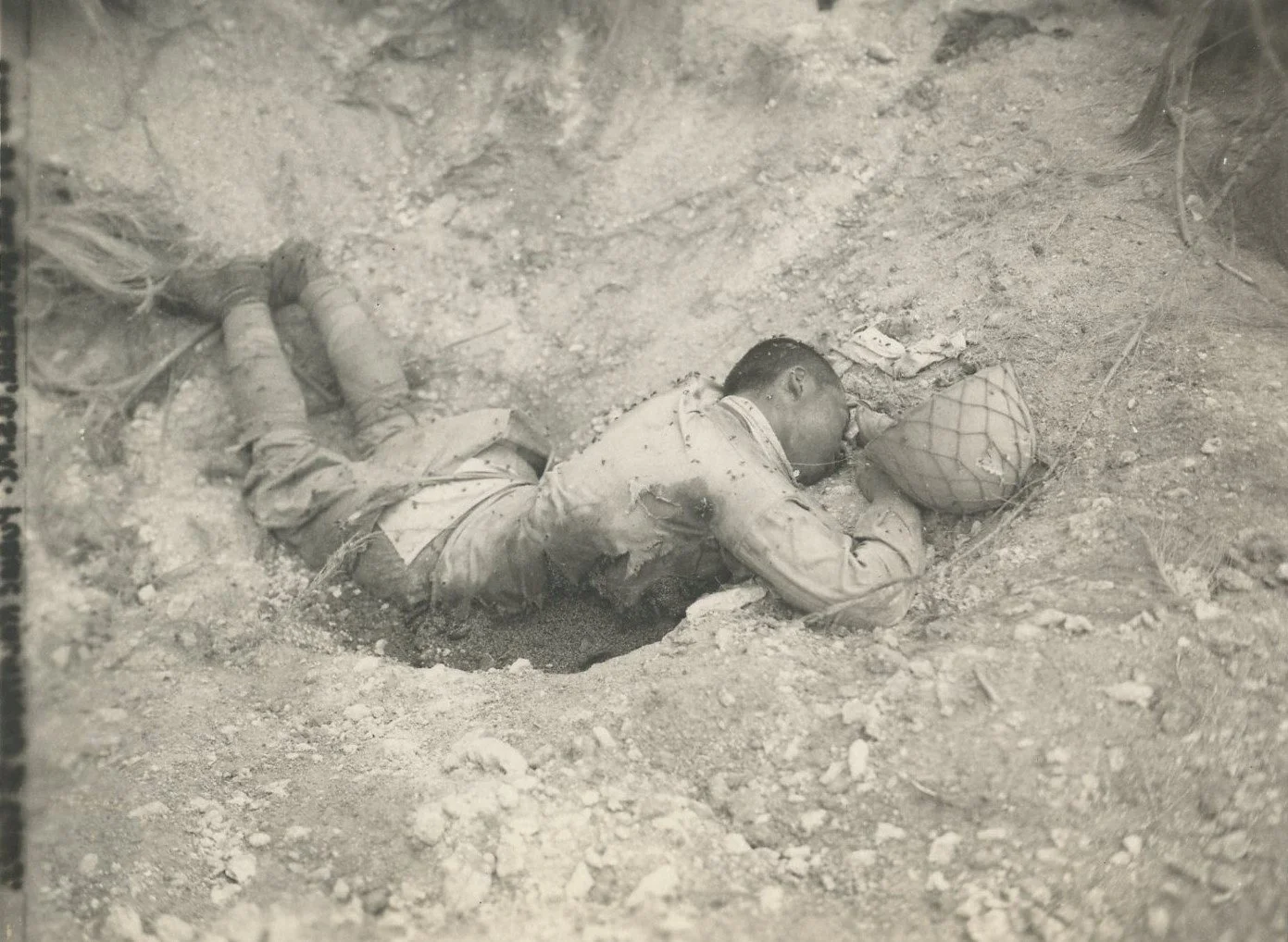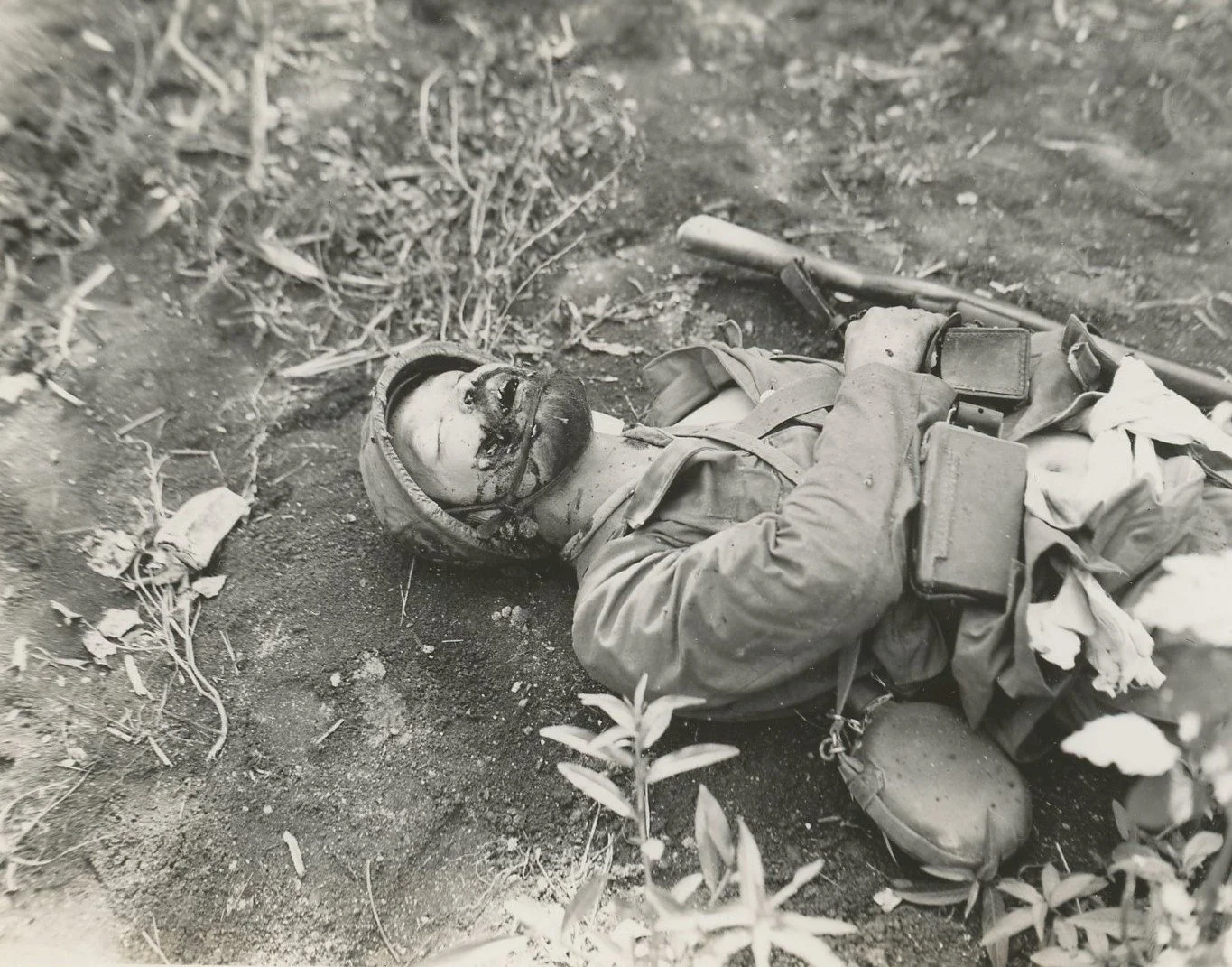 Three Imperial Japanese Army soldiers lie where they were killed.