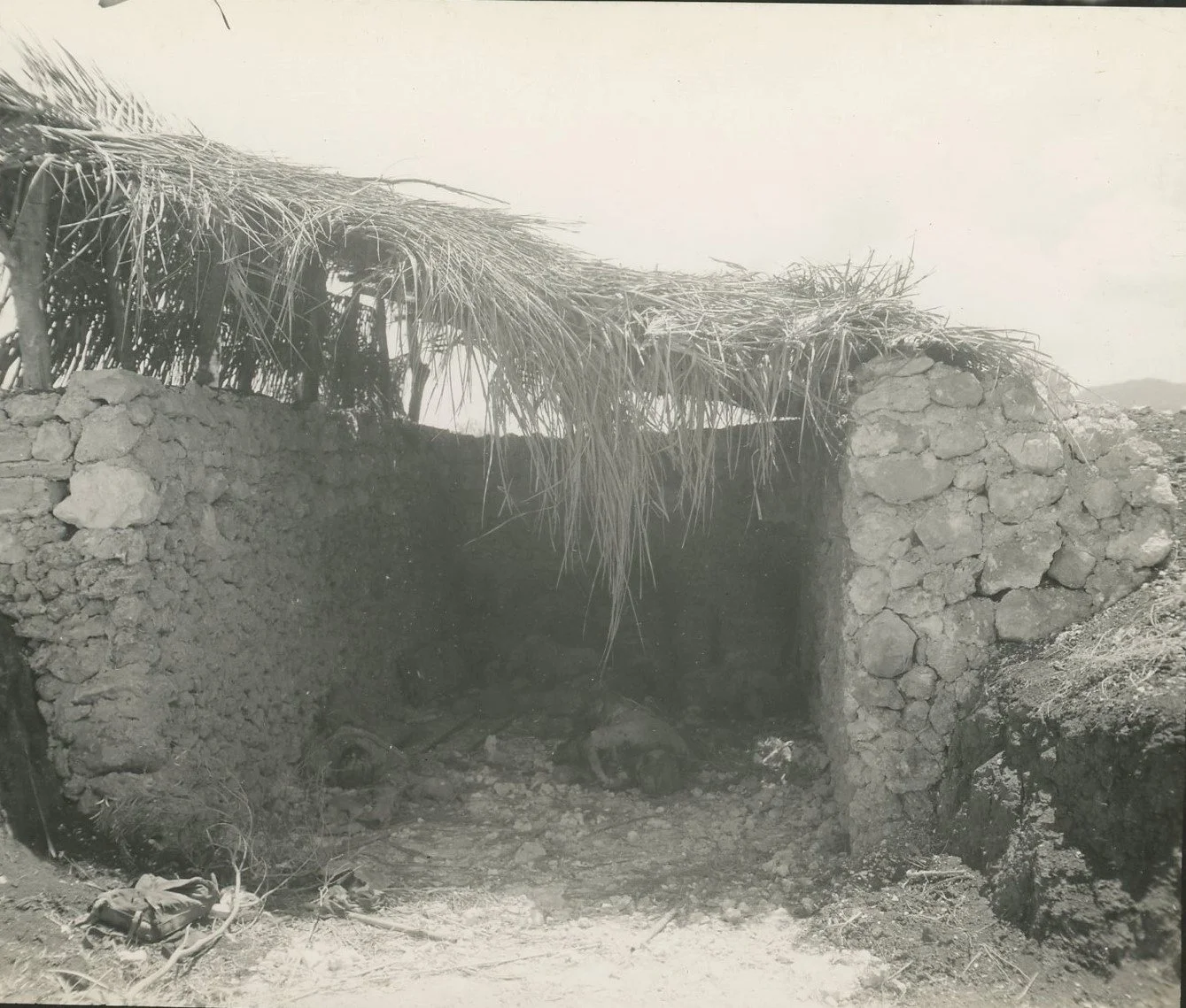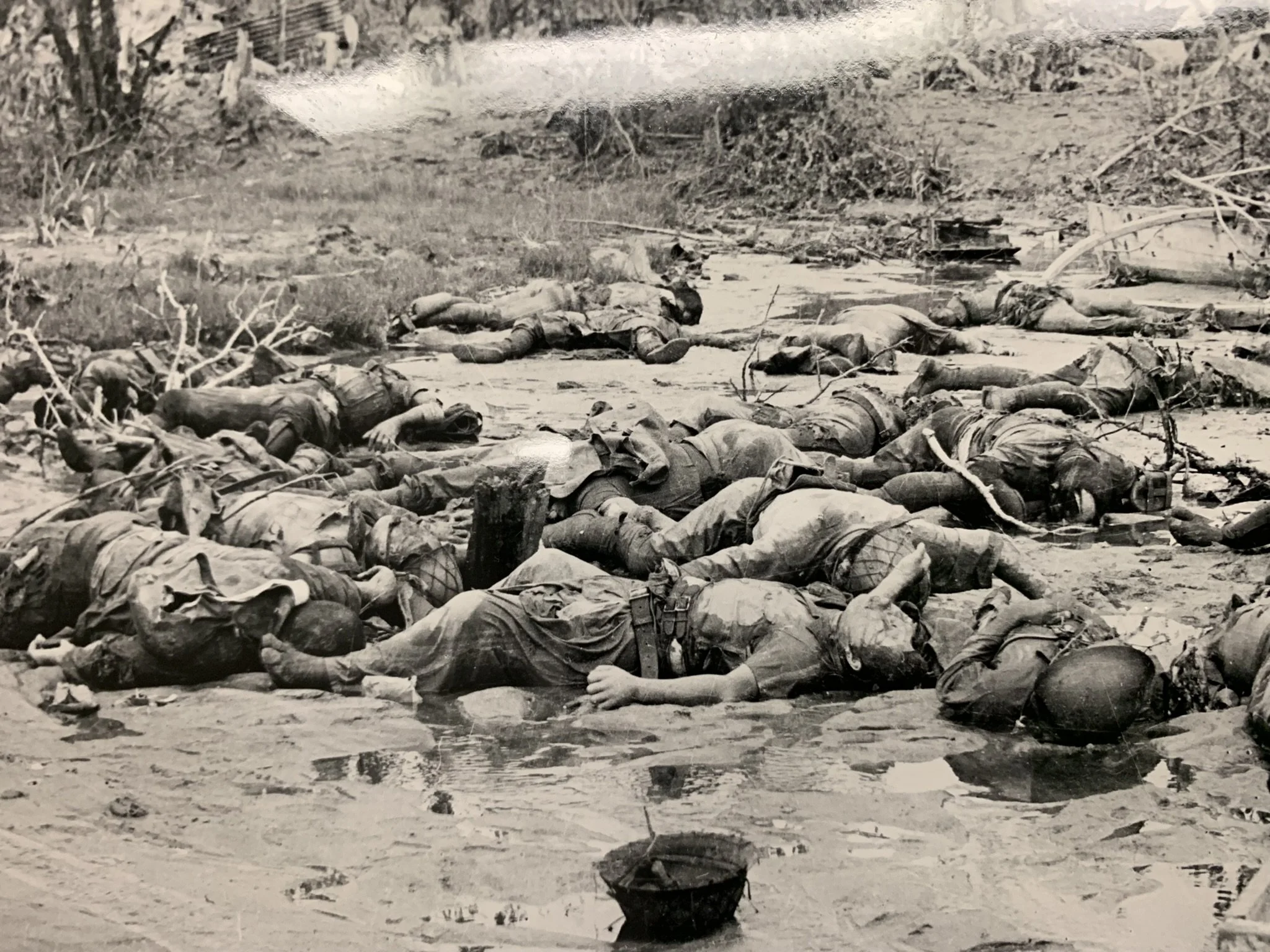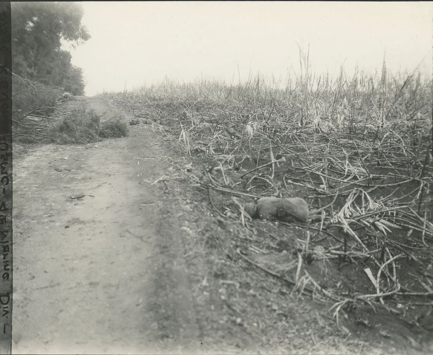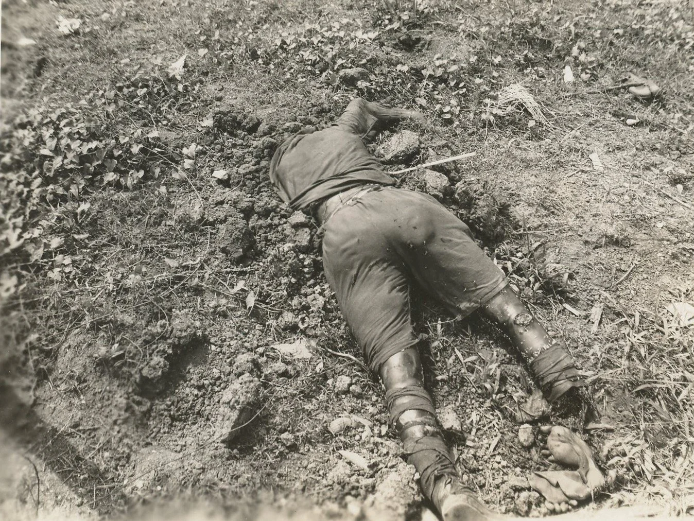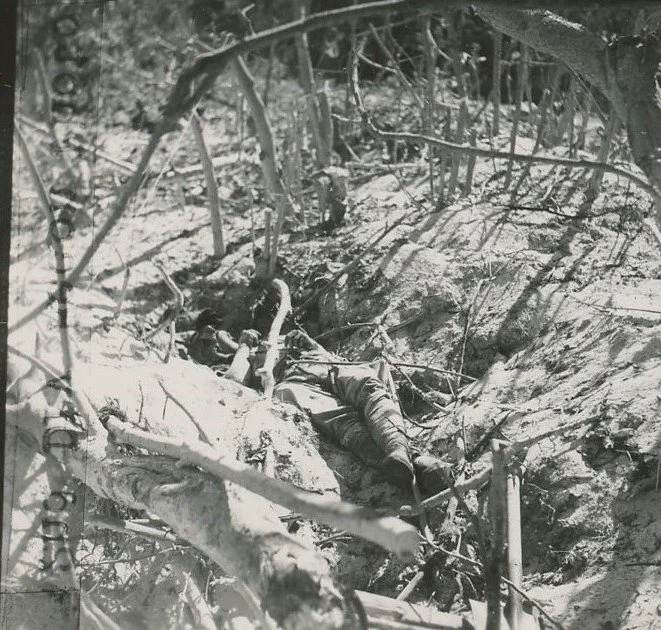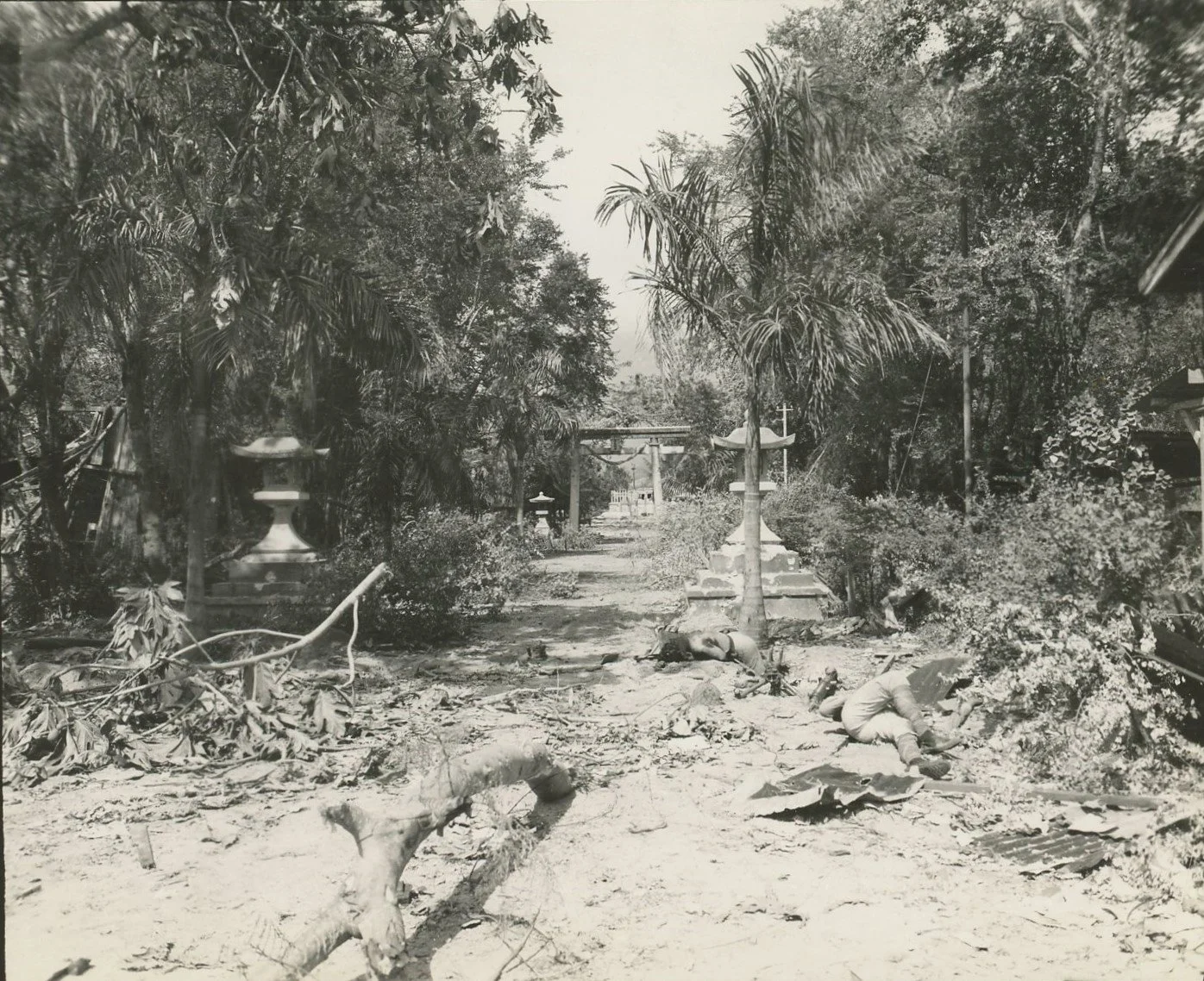 Three Imperial Japanese Army soldiers lie where they were killed.