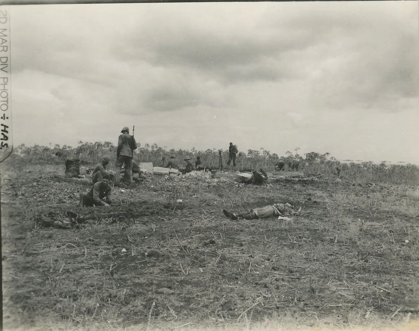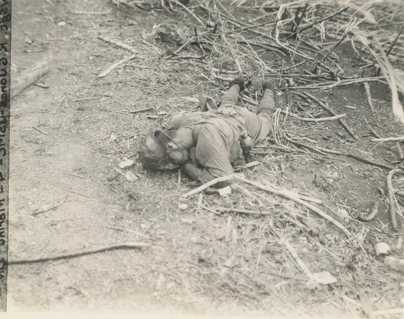An Imperial Japanese Army soldier killed by Marines during a patrol is visible in the scene.