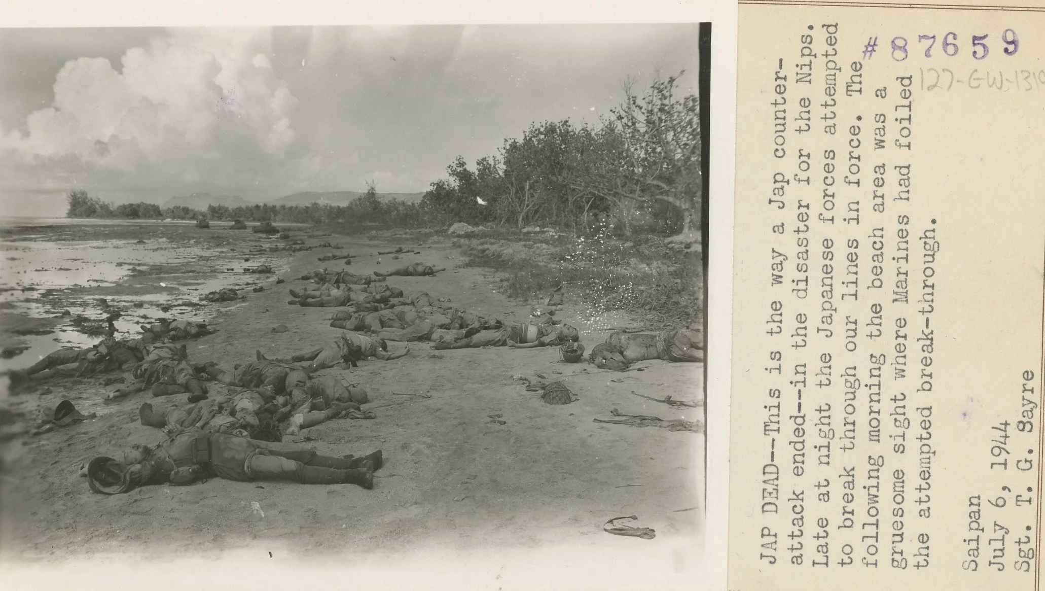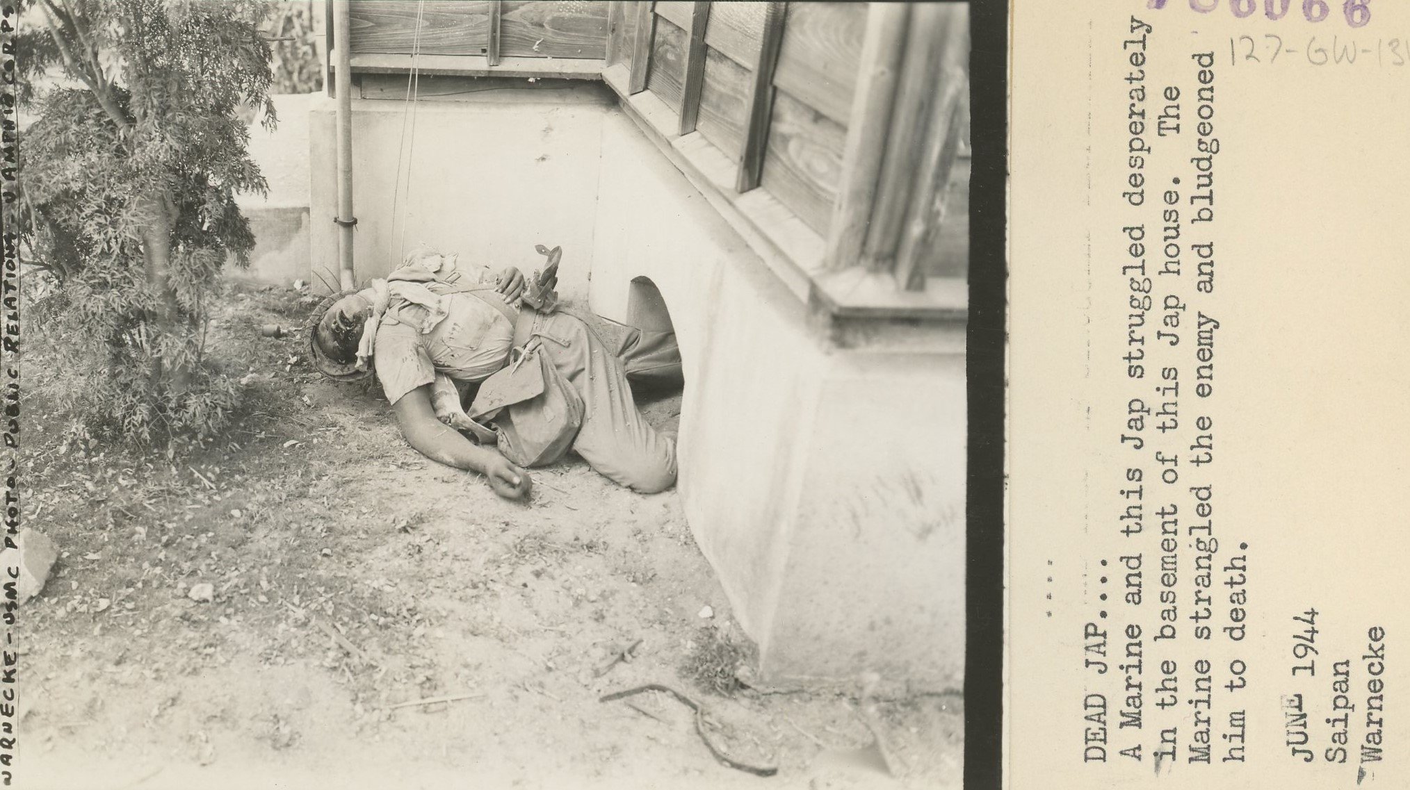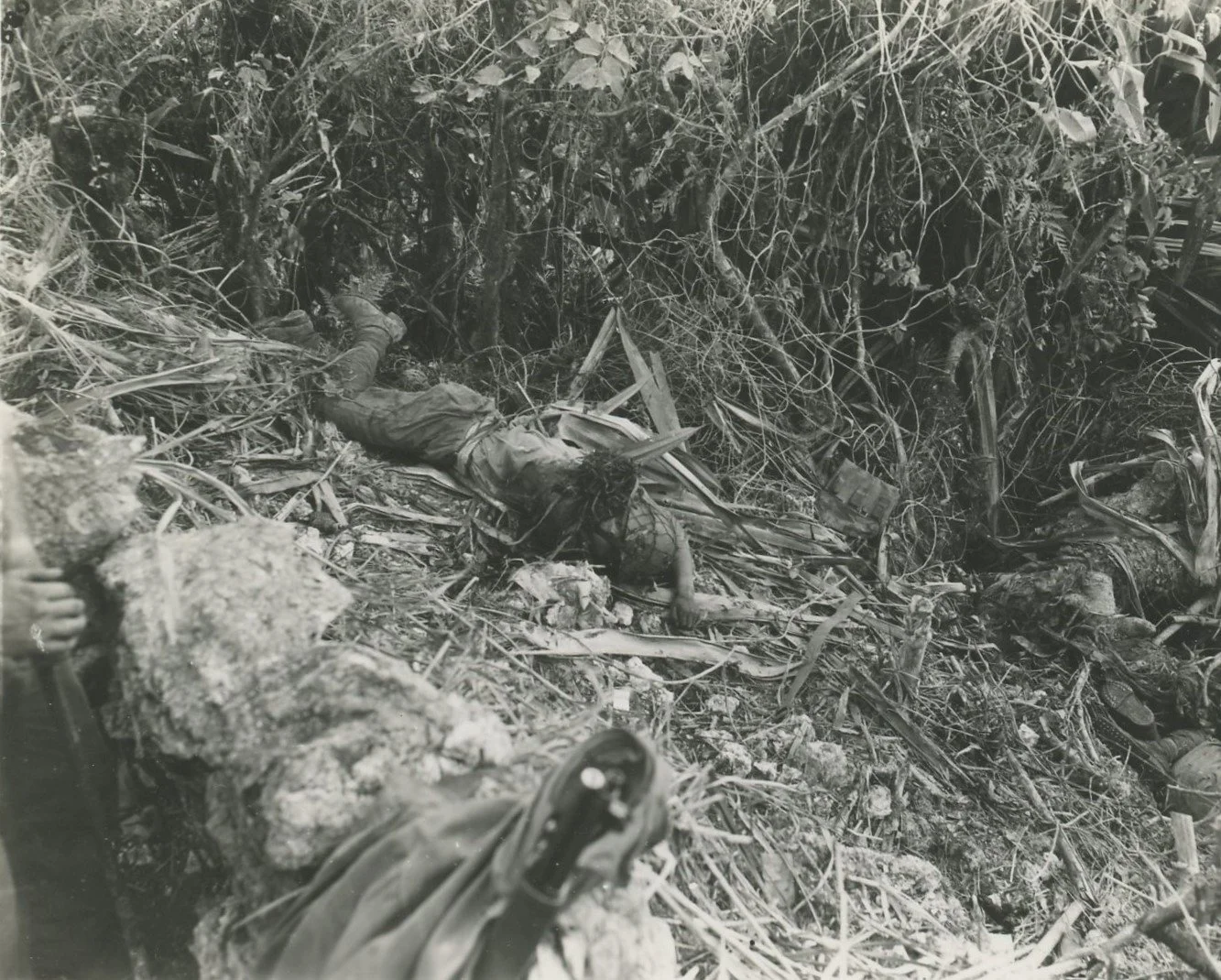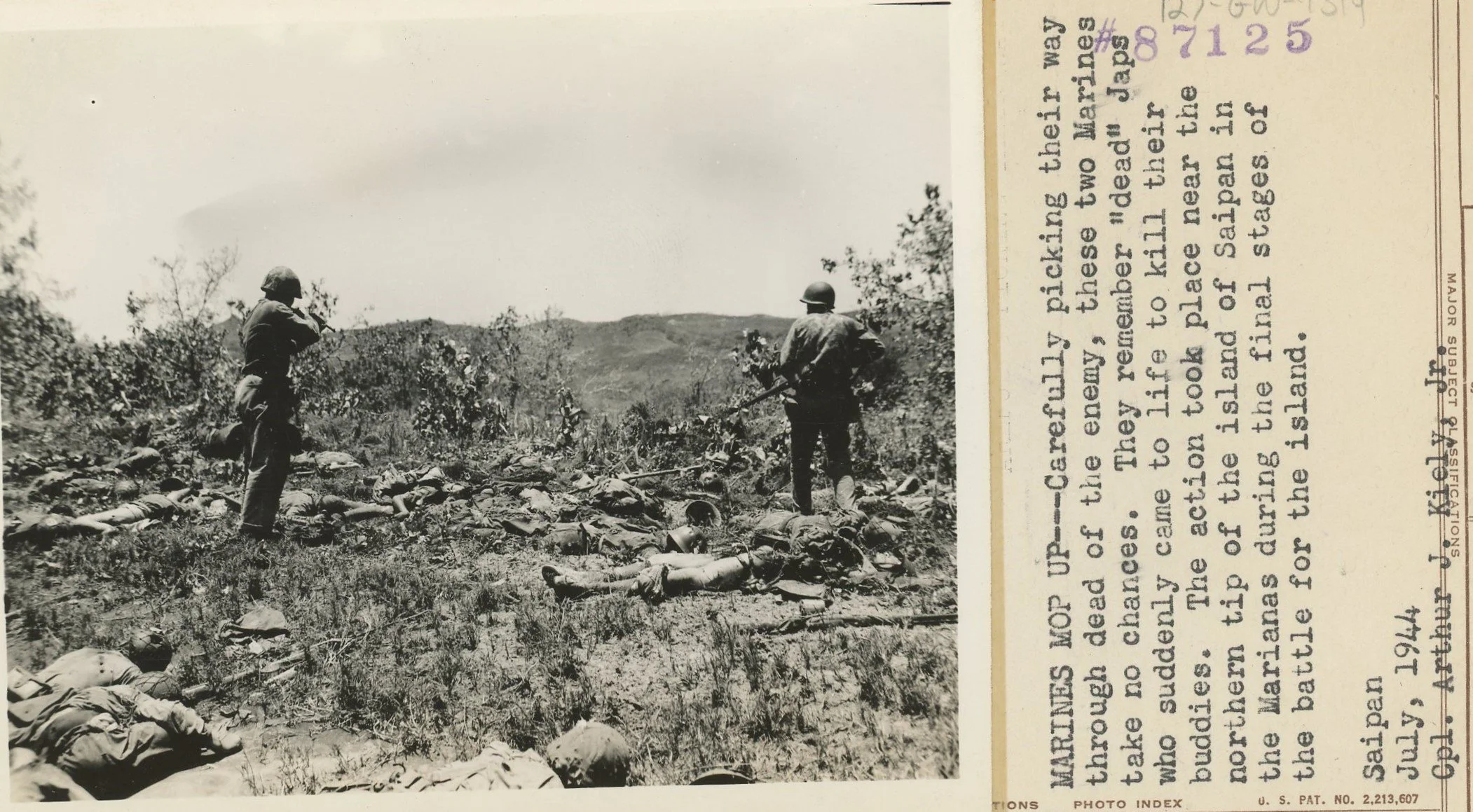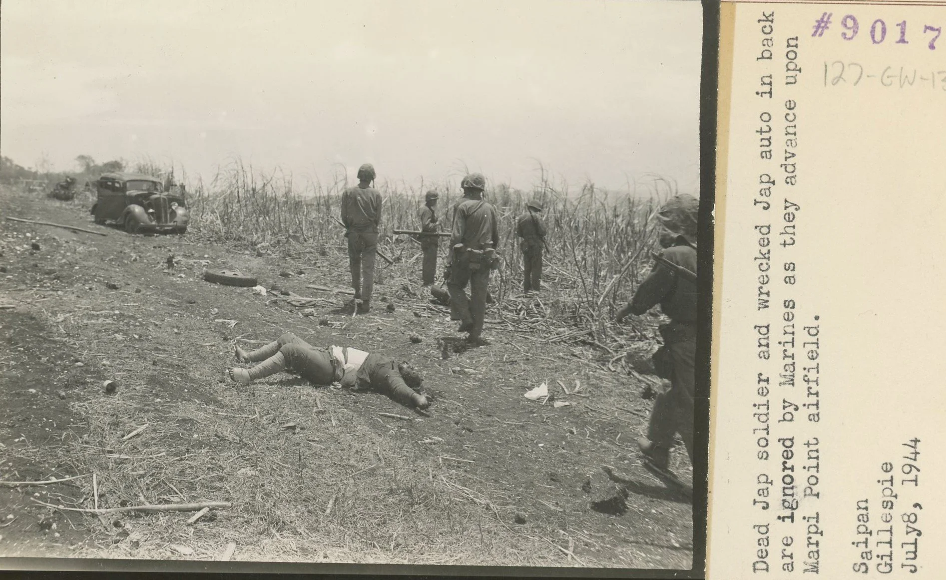 A member of the Imperial Japanese Navy killed near Garapan in 1944 is visible in the scene.