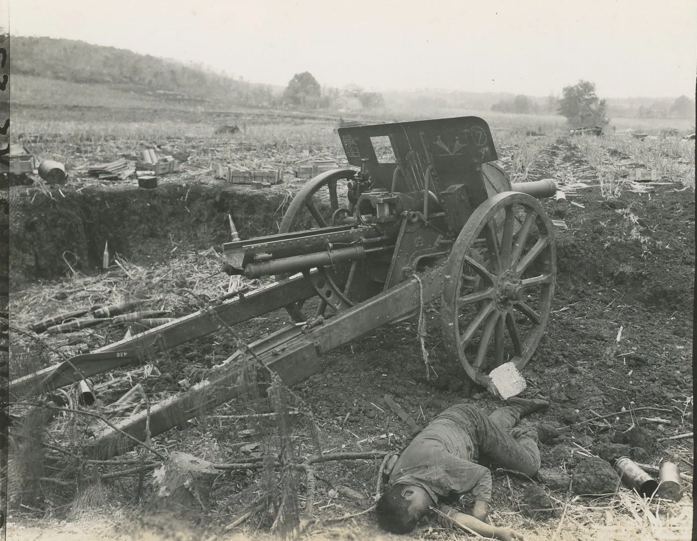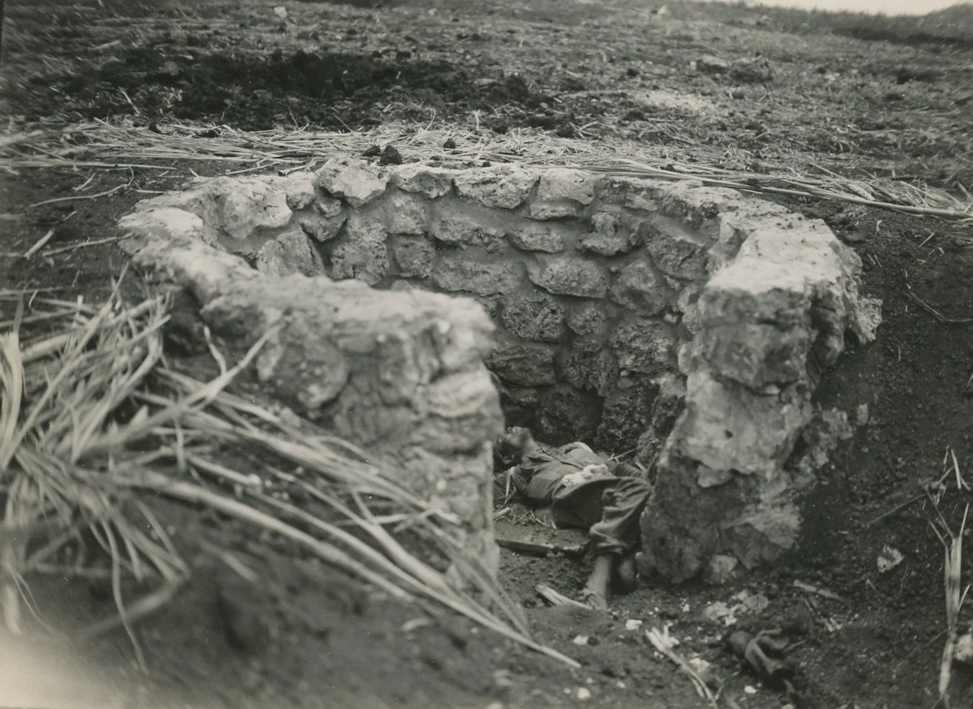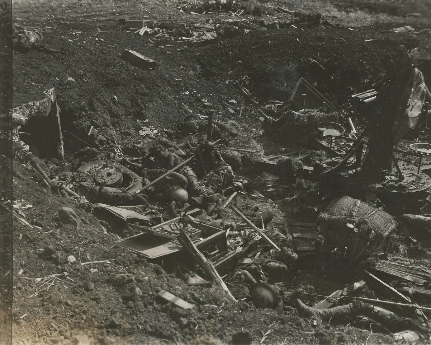 An Imperial Japanese Army officer and soldier lie in the trench where they were killed, which leads to a wheeled artillery piece.