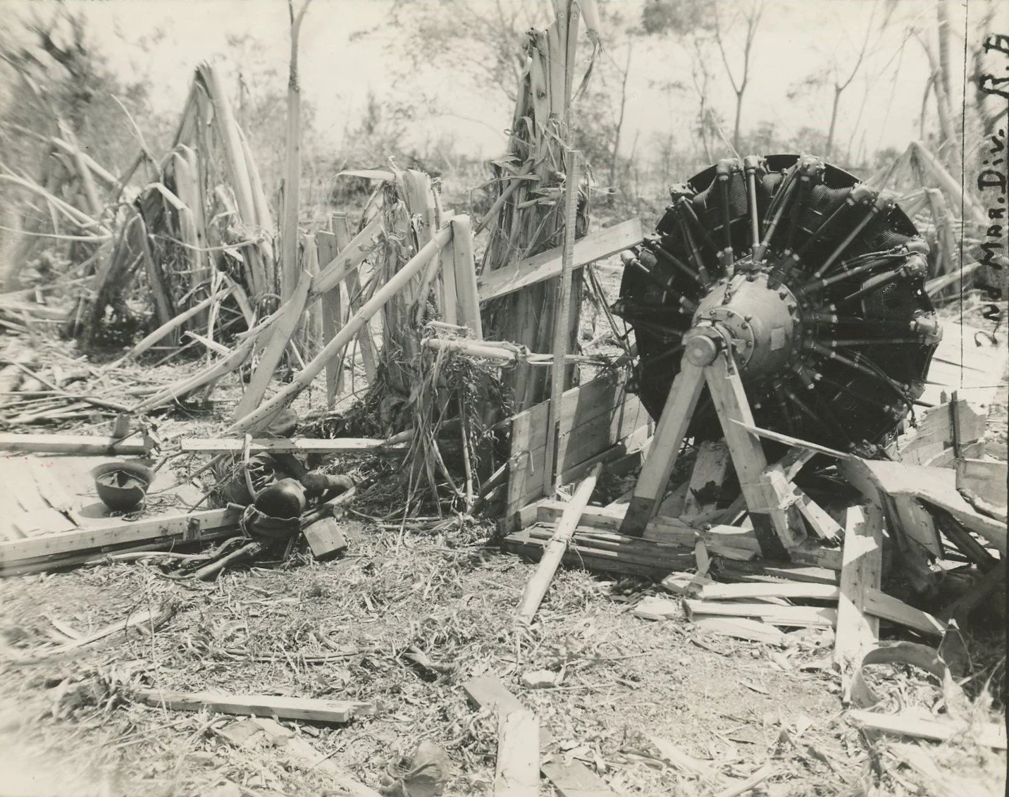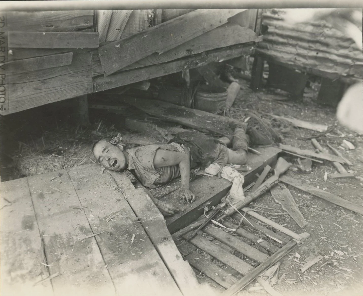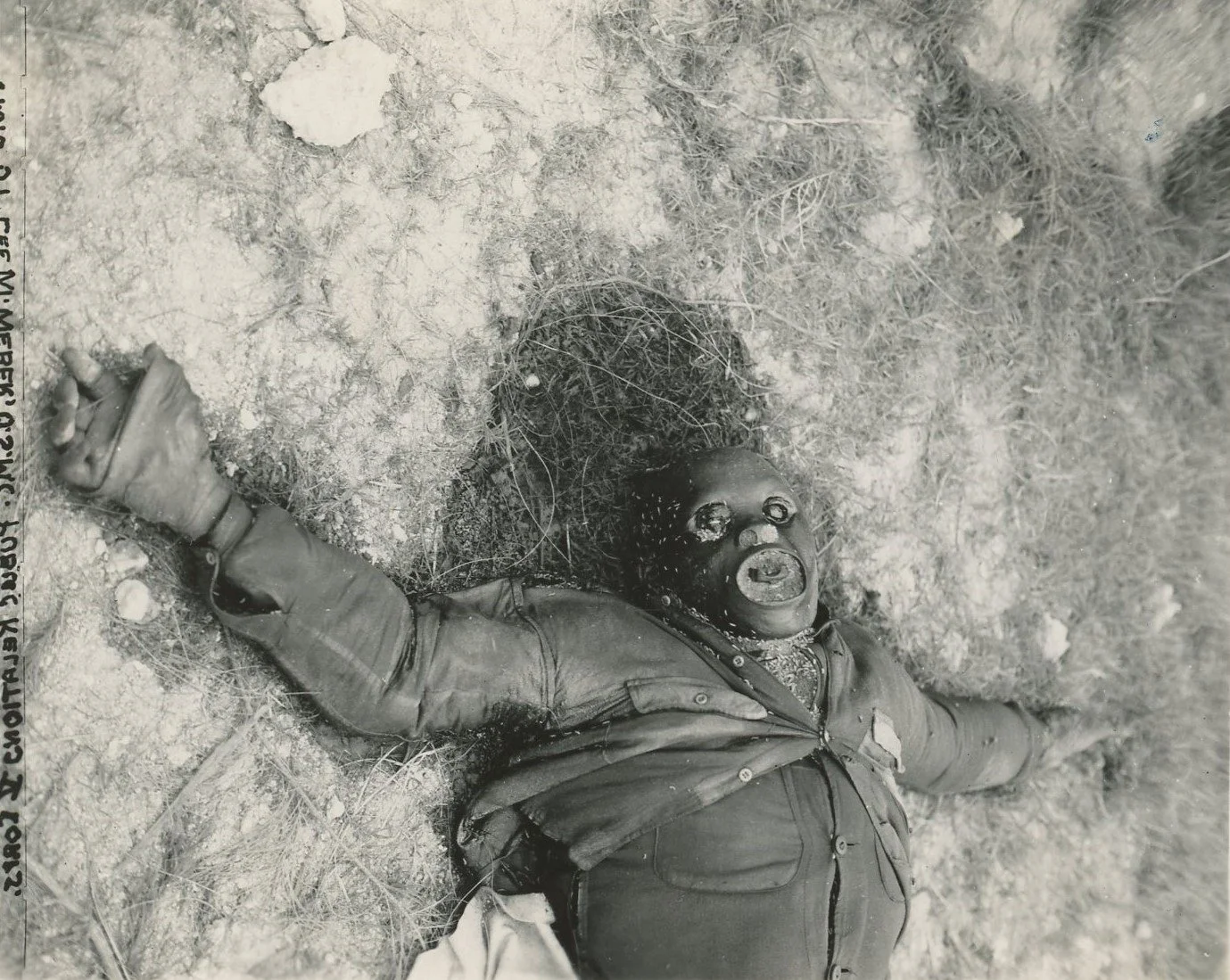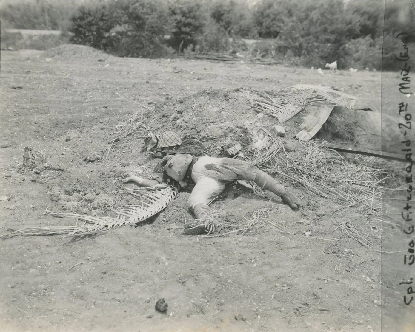 The charred remains of a Japanese soldier lie next to a pile of Type 99 rifles, all retaining their monopods and other early-war features.