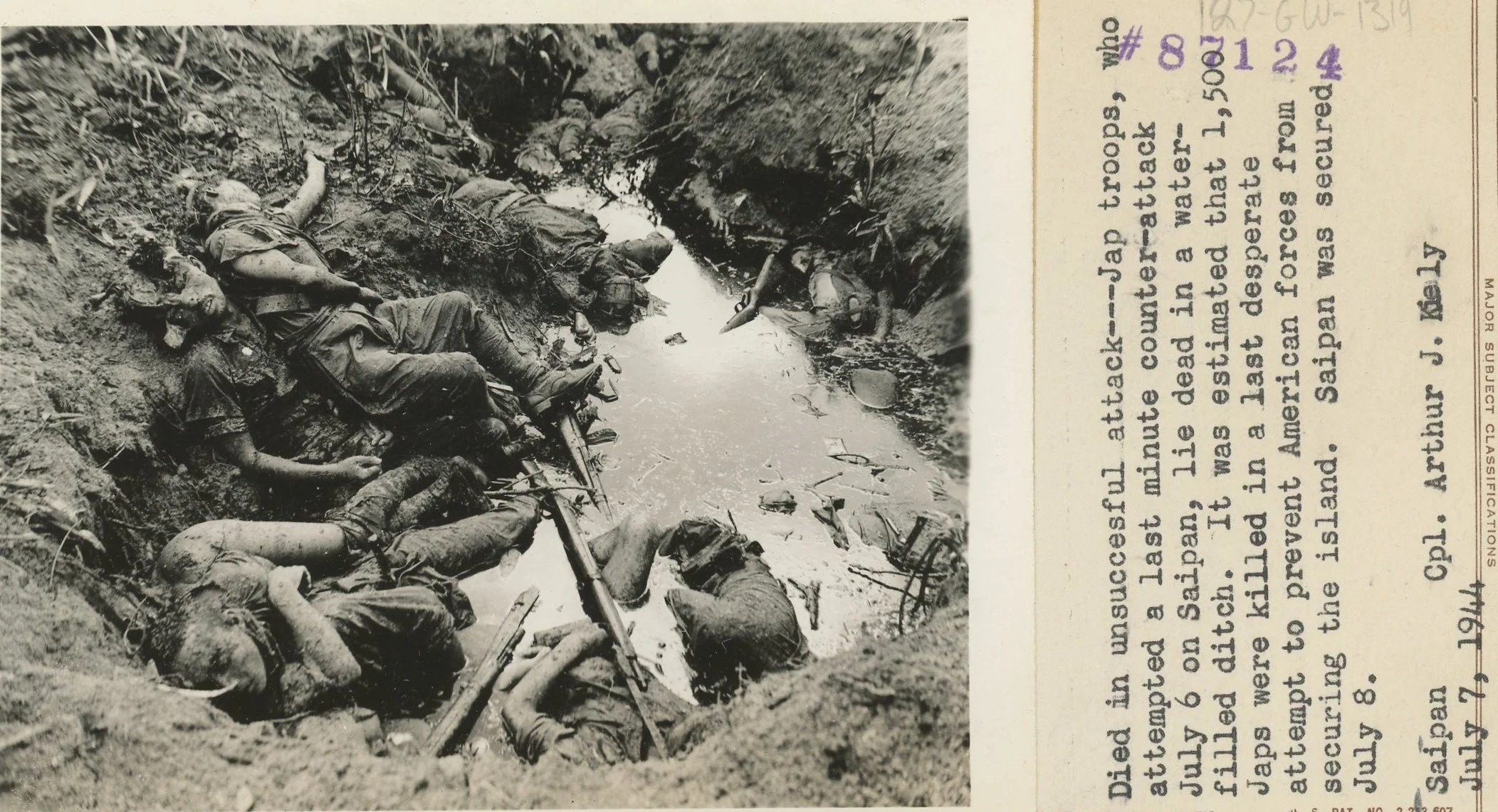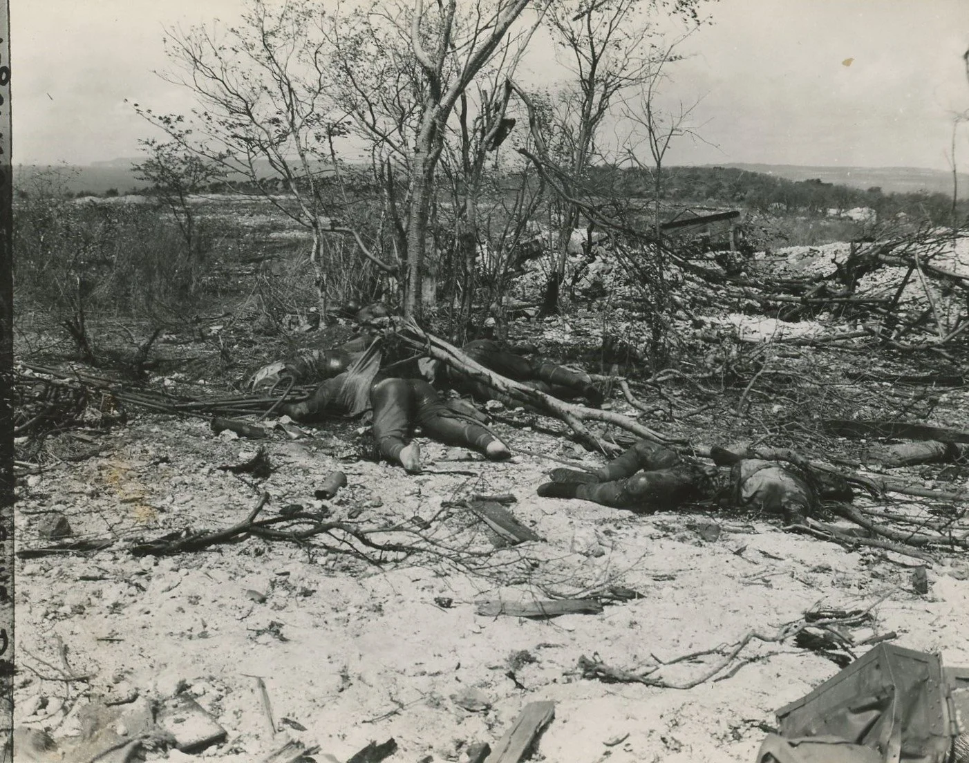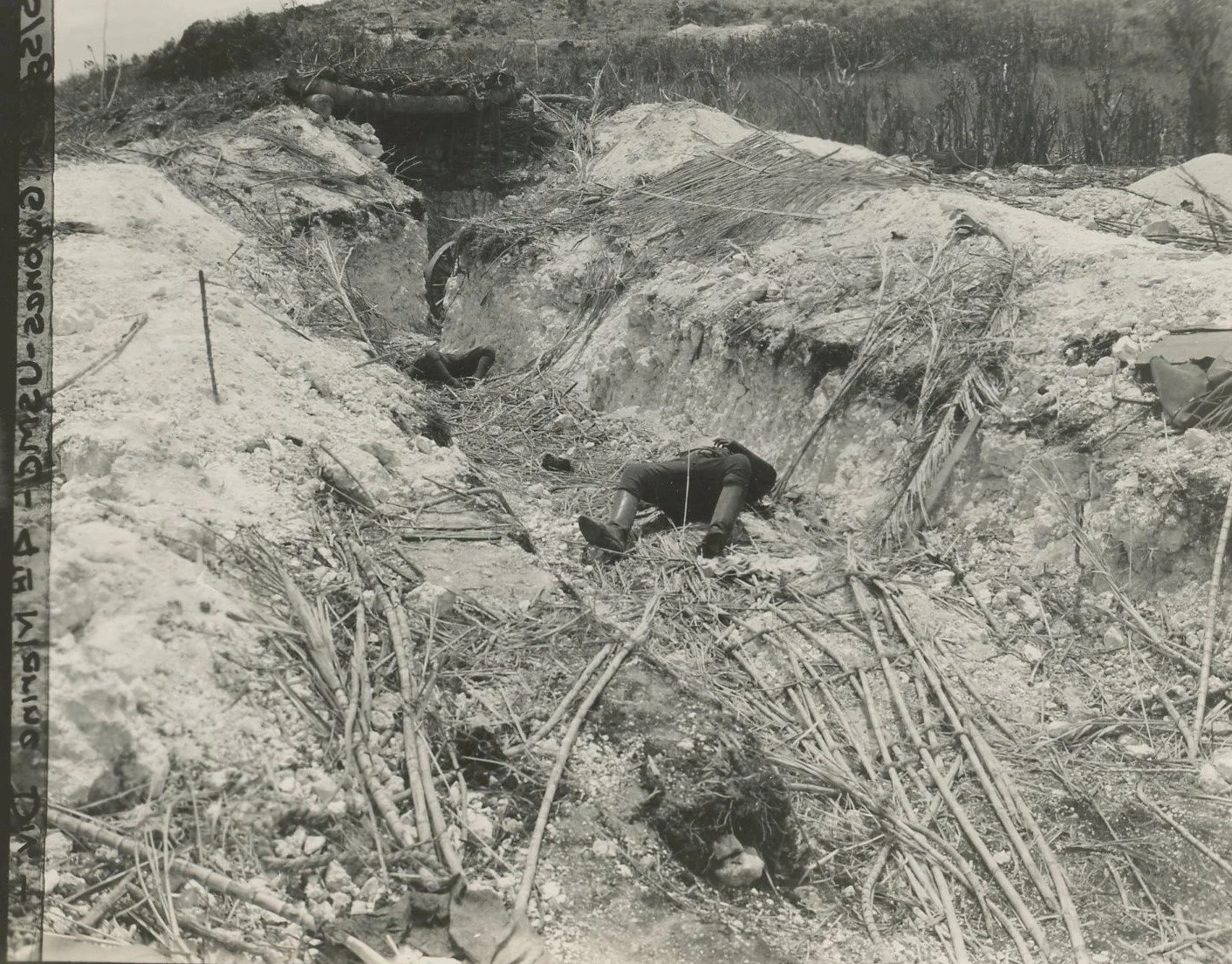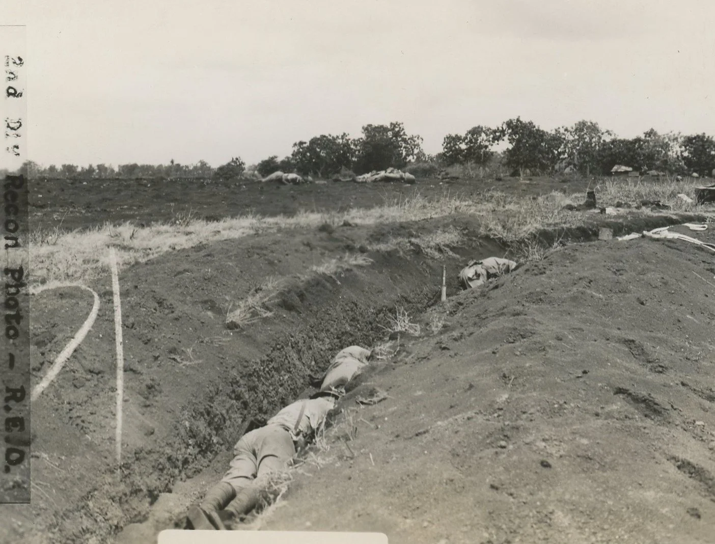Four Imperial Japanese Navy personnel lie in a ditch following a failed counterattack during the fighting at Garapan, 1944.