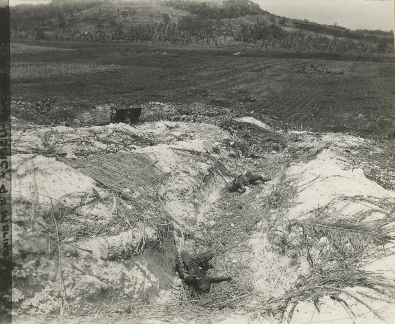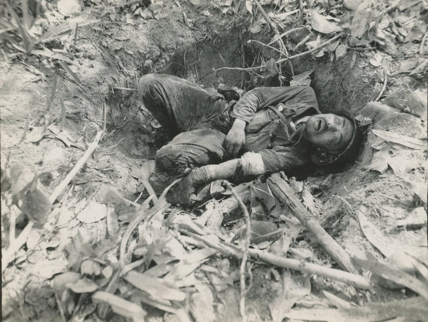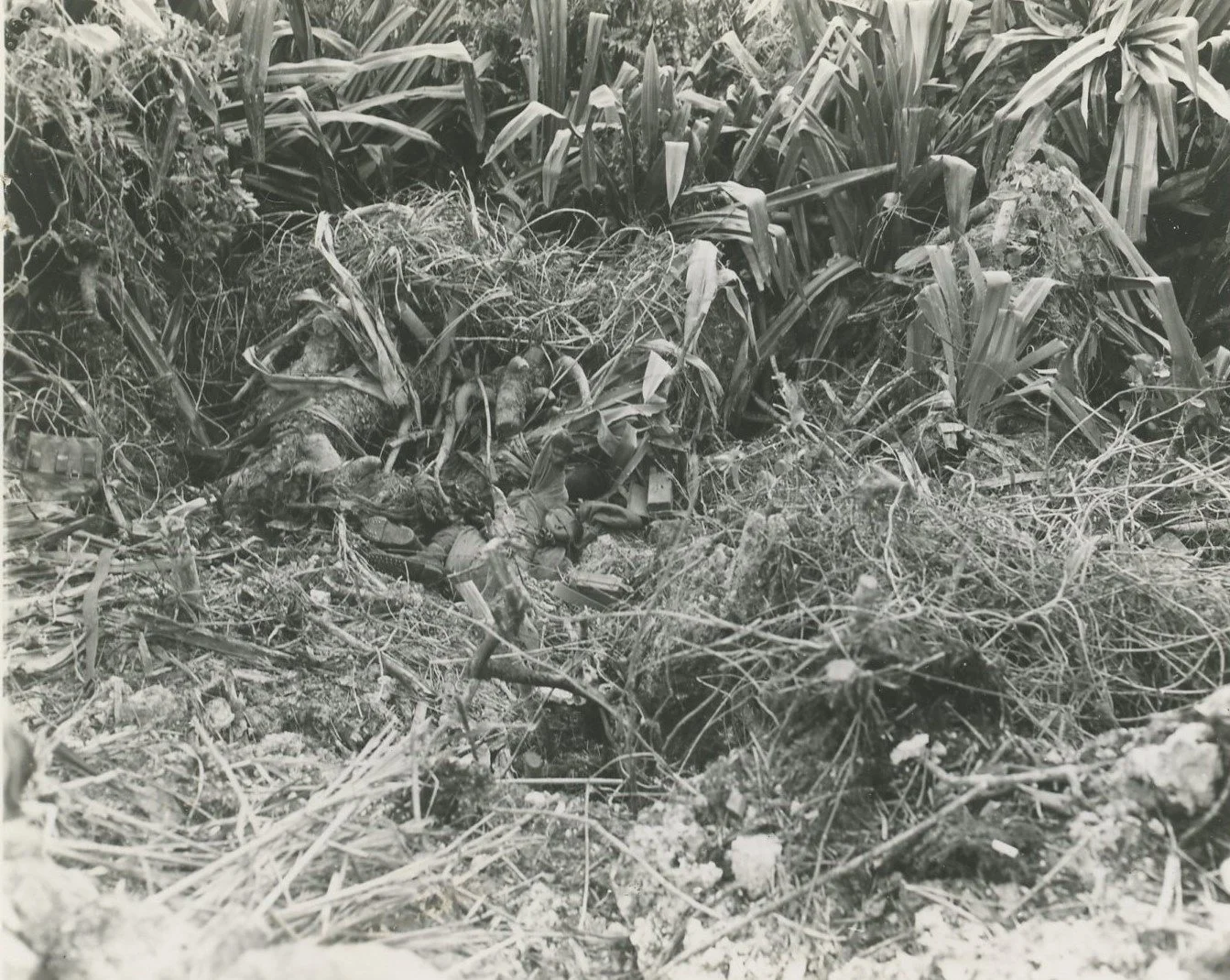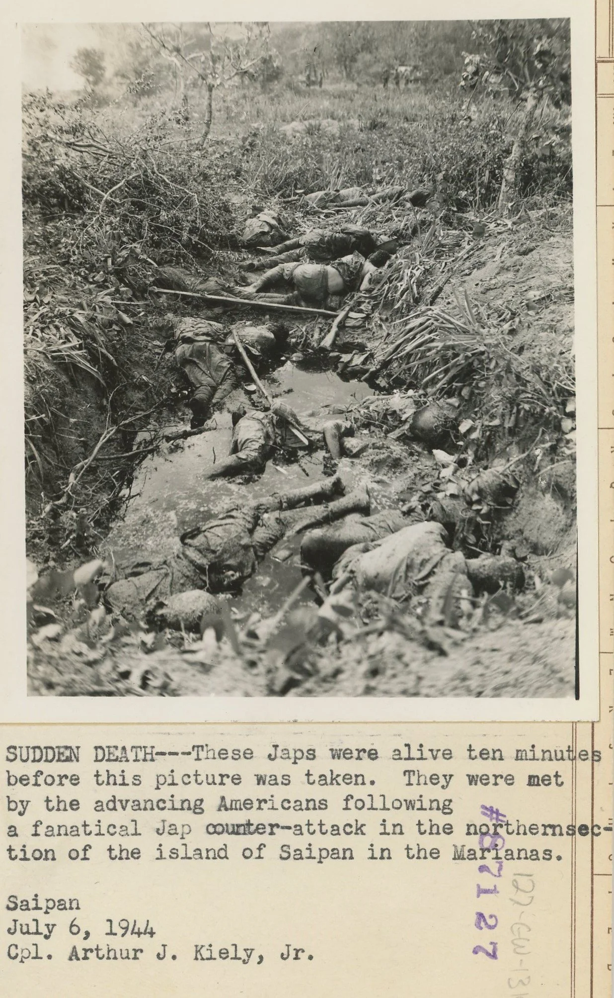 Four Imperial Japanese Navy personnel lie in a ditch following a failed counterattack during the fighting at Garapan, 1944.