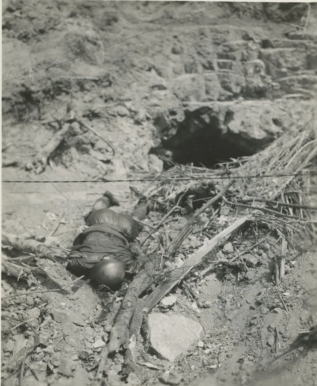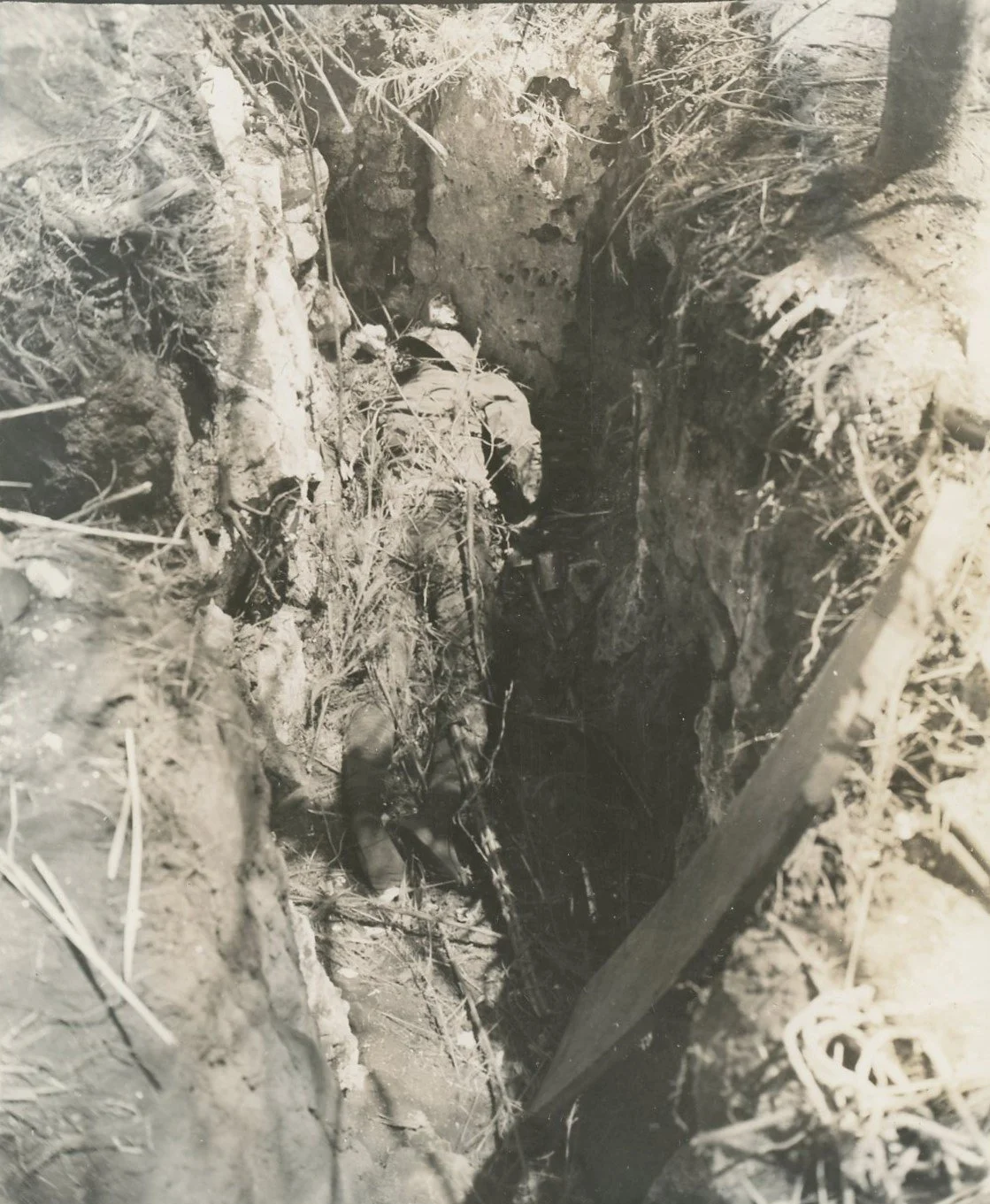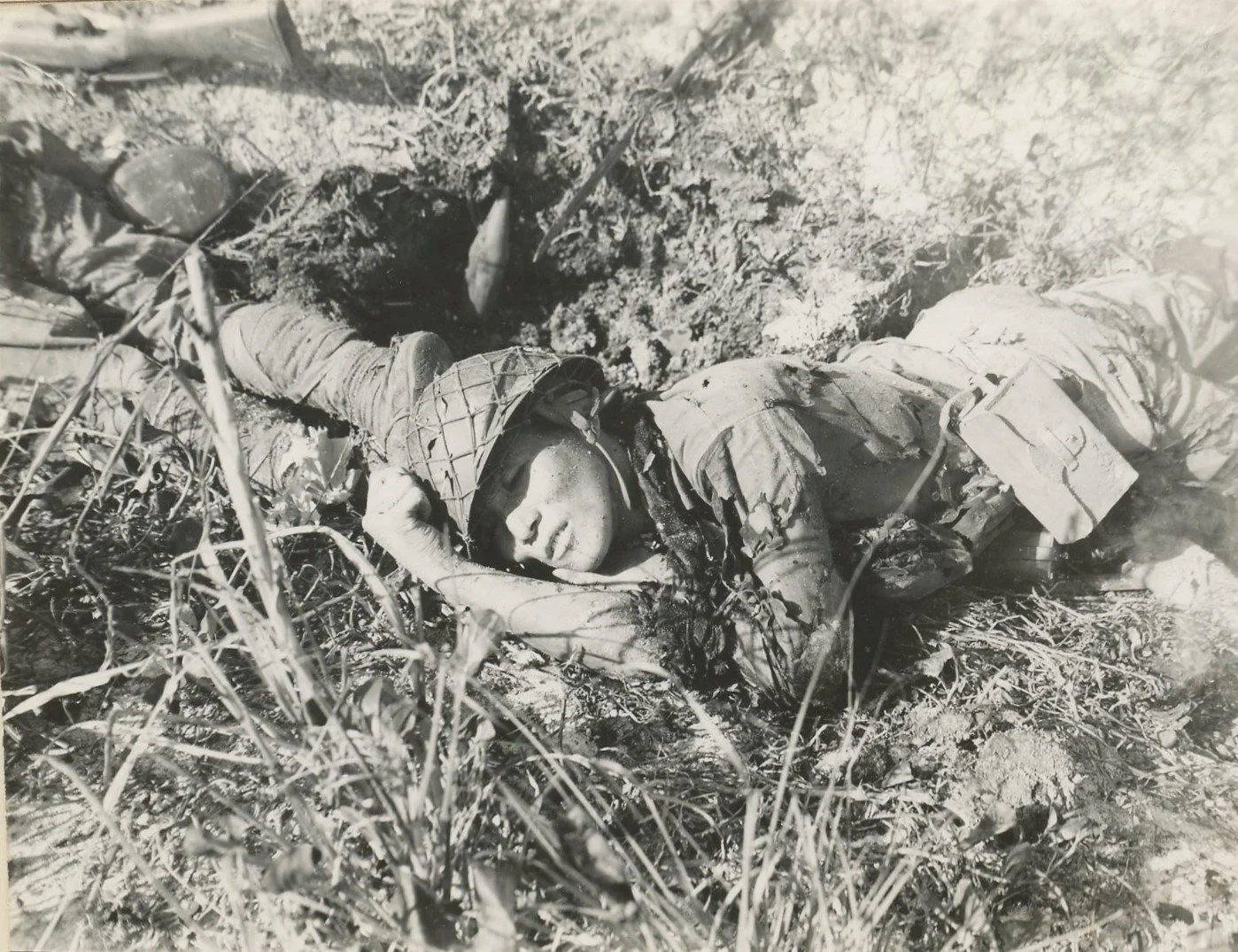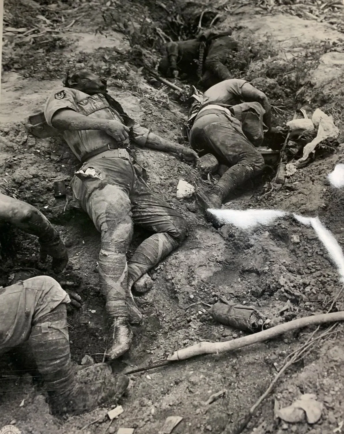 Four Imperial Japanese Navy personnel lie in a ditch following a failed counterattack during the fighting at Garapan, 1944.