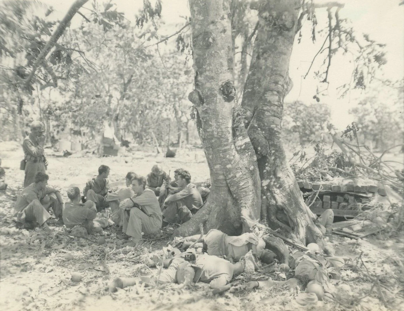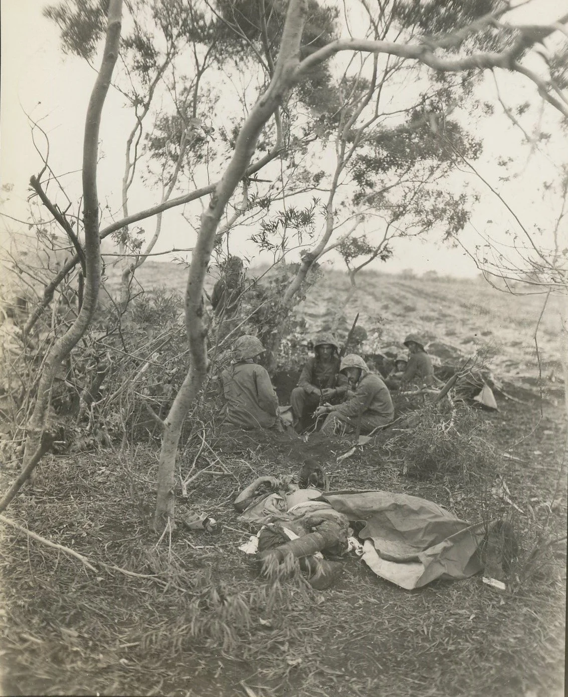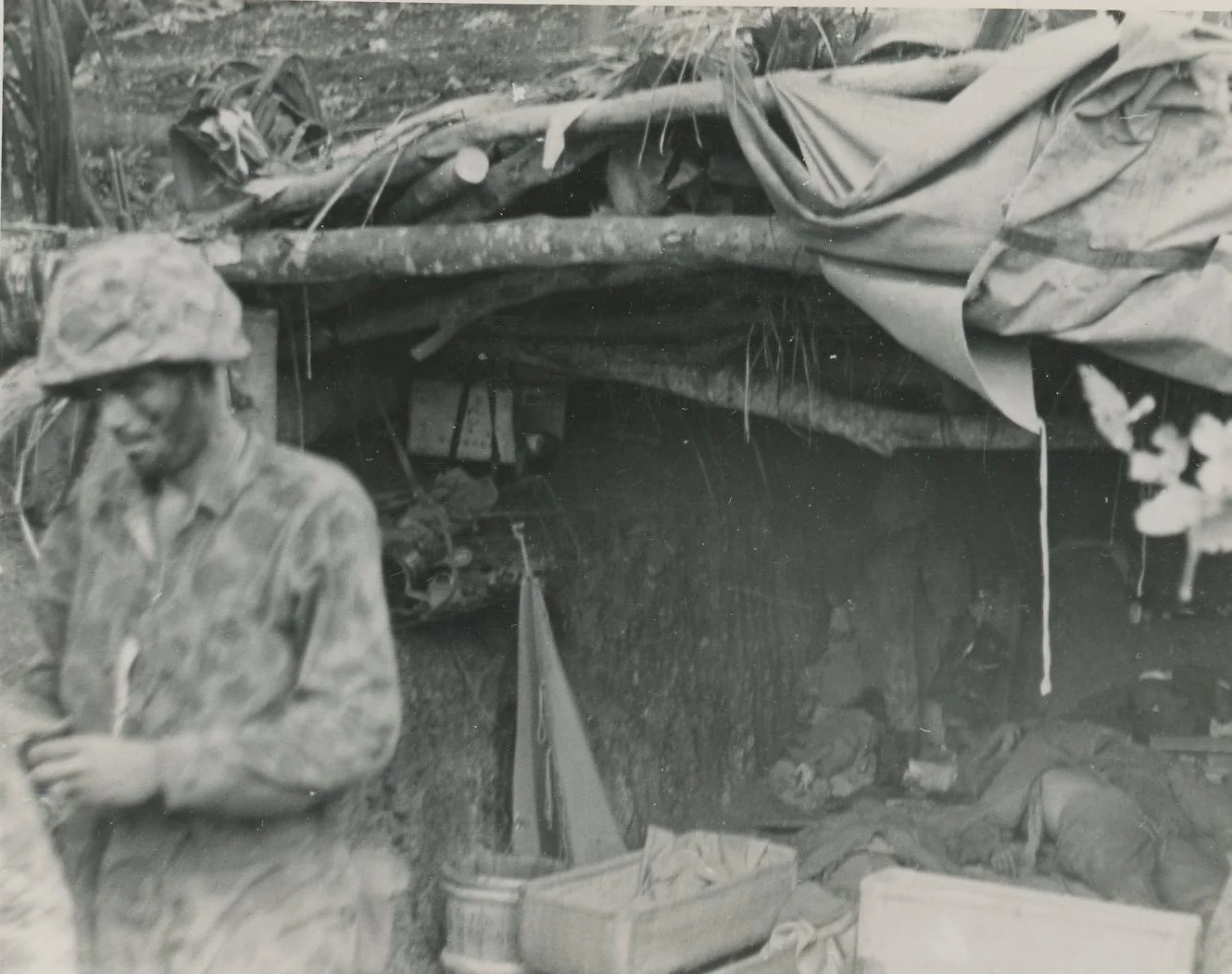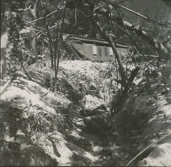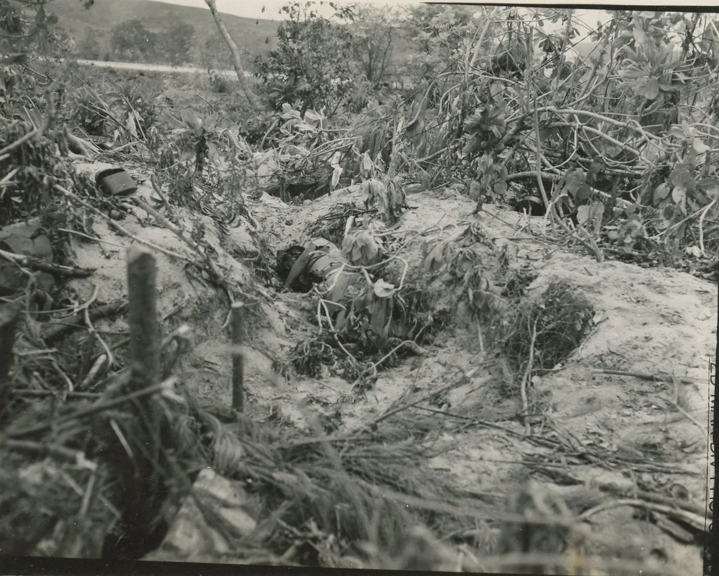 Four Imperial Japanese Navy personnel lie in a ditch following a failed counterattack during the fighting at Garapan, 1944.