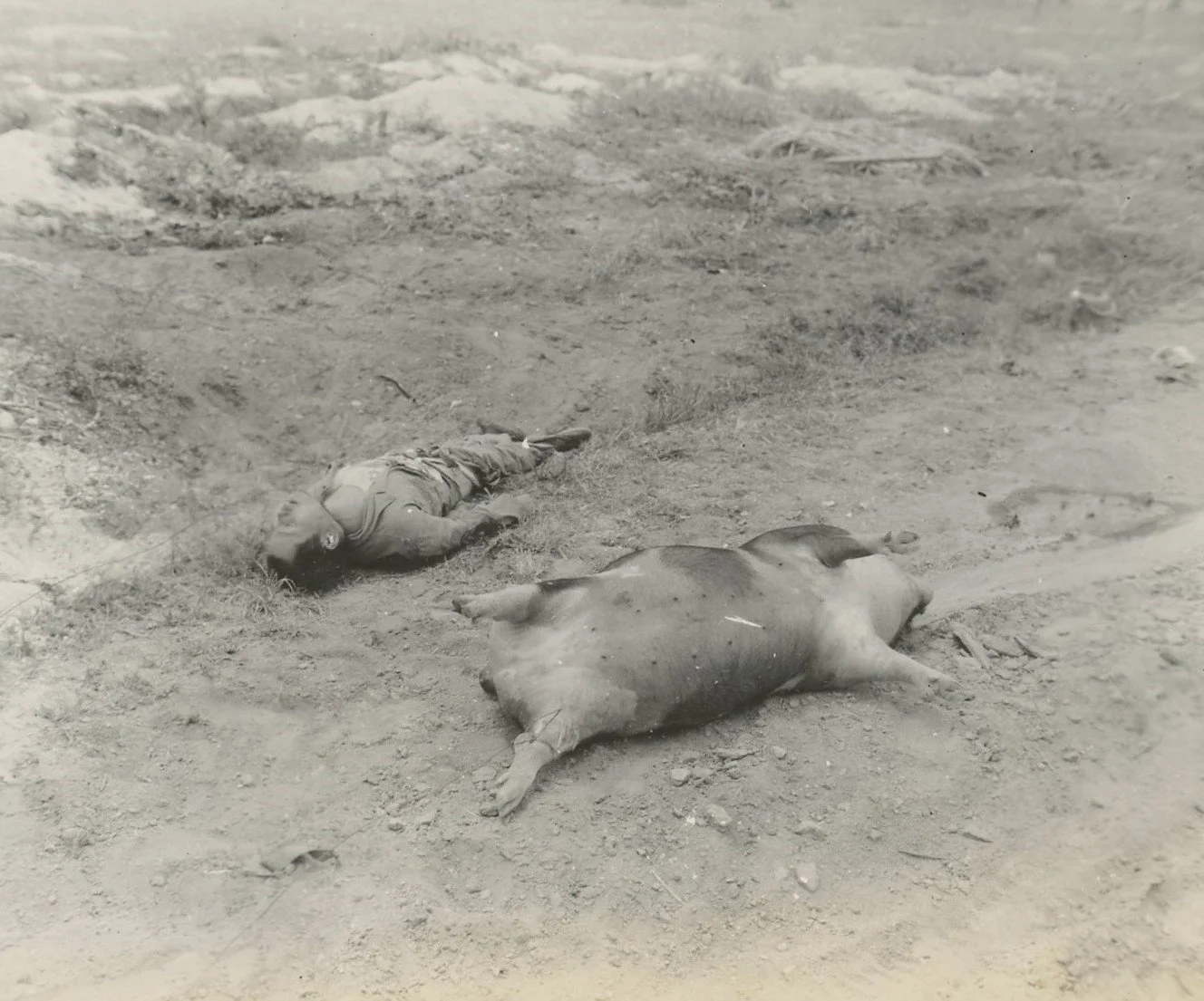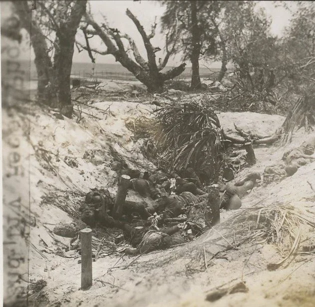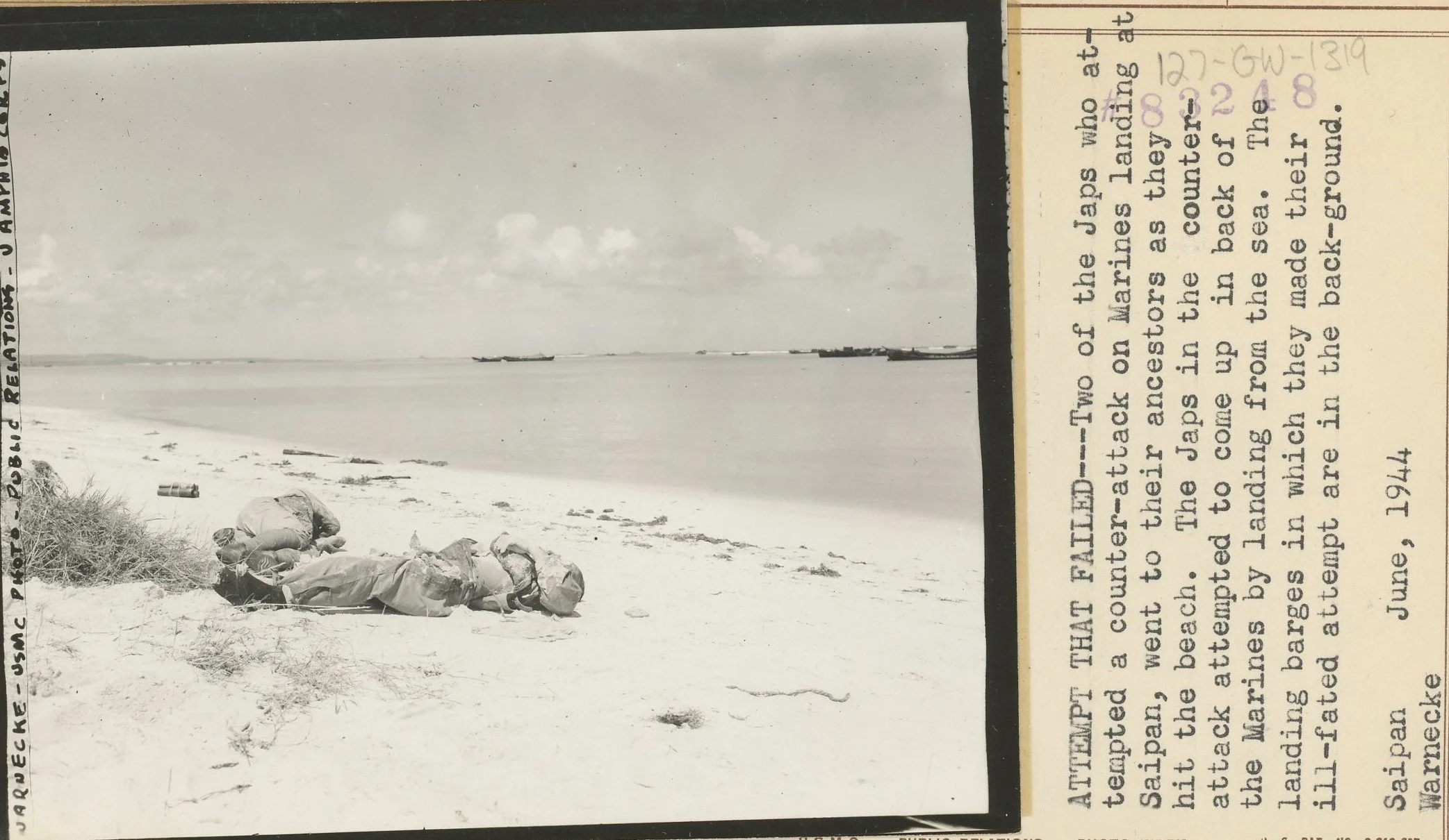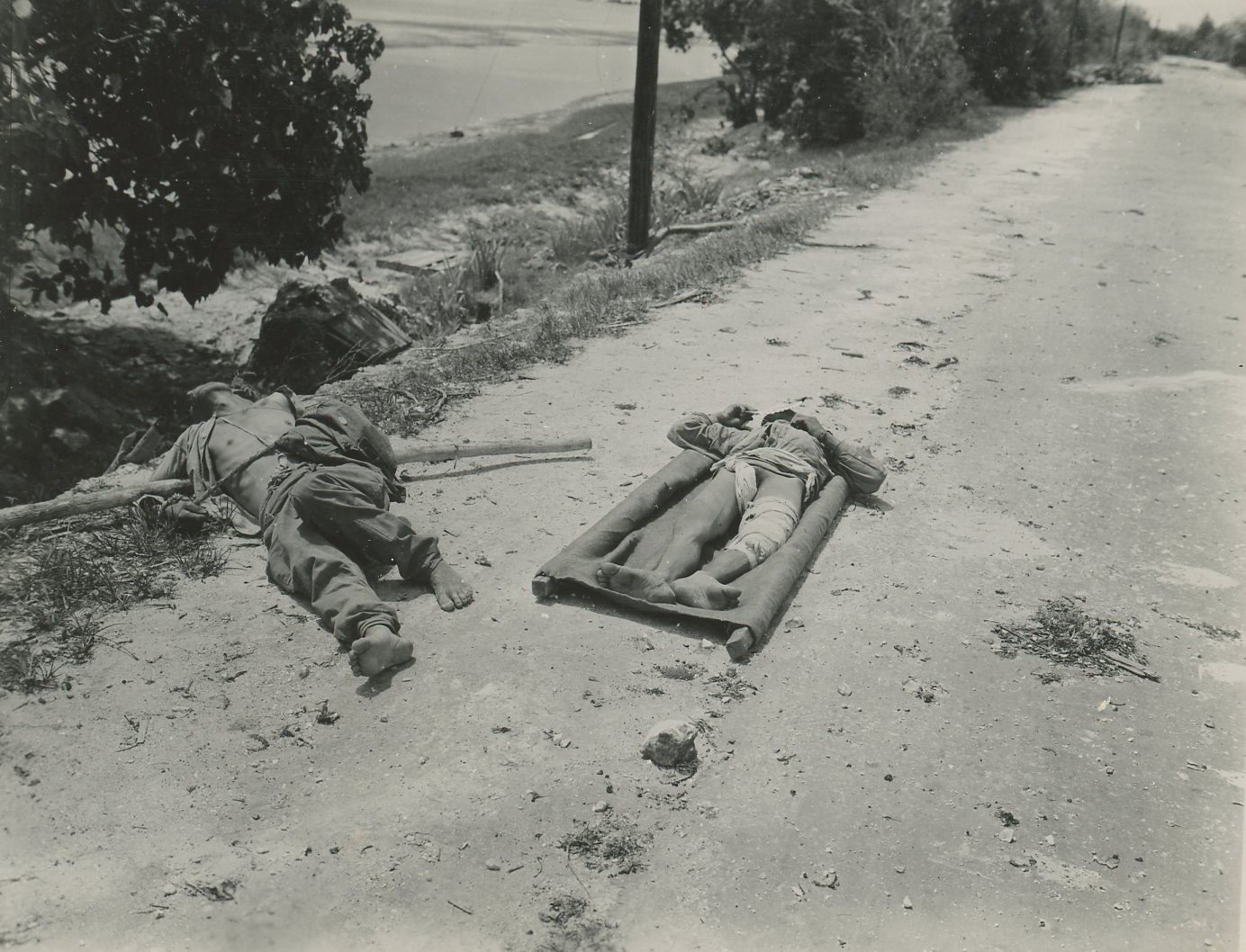 Two Imperial Japanese personnel, killed on Tanapag beach during a failed counter-attack. They are wearing unknown uniforms, but both wear closed-toe tabi.
