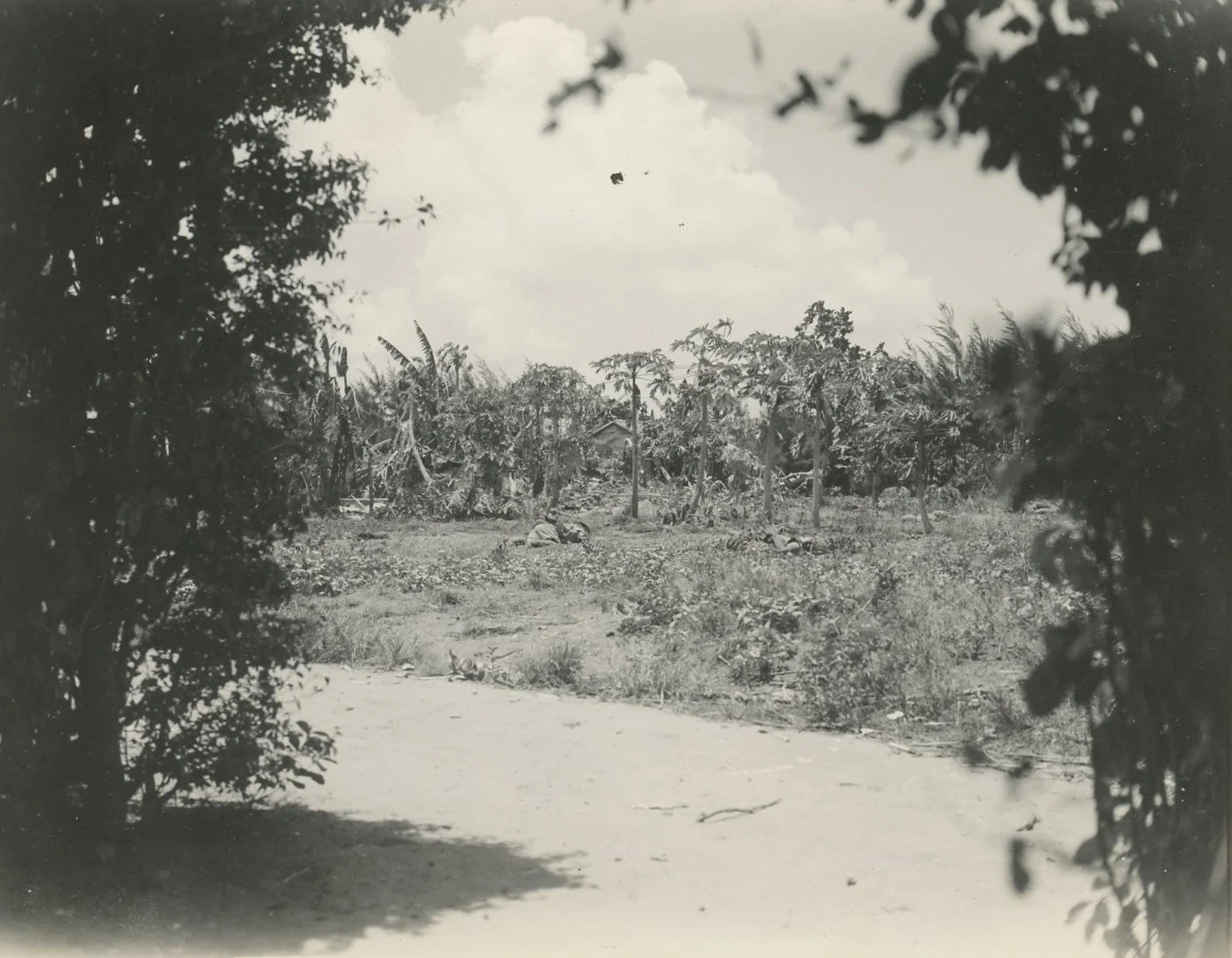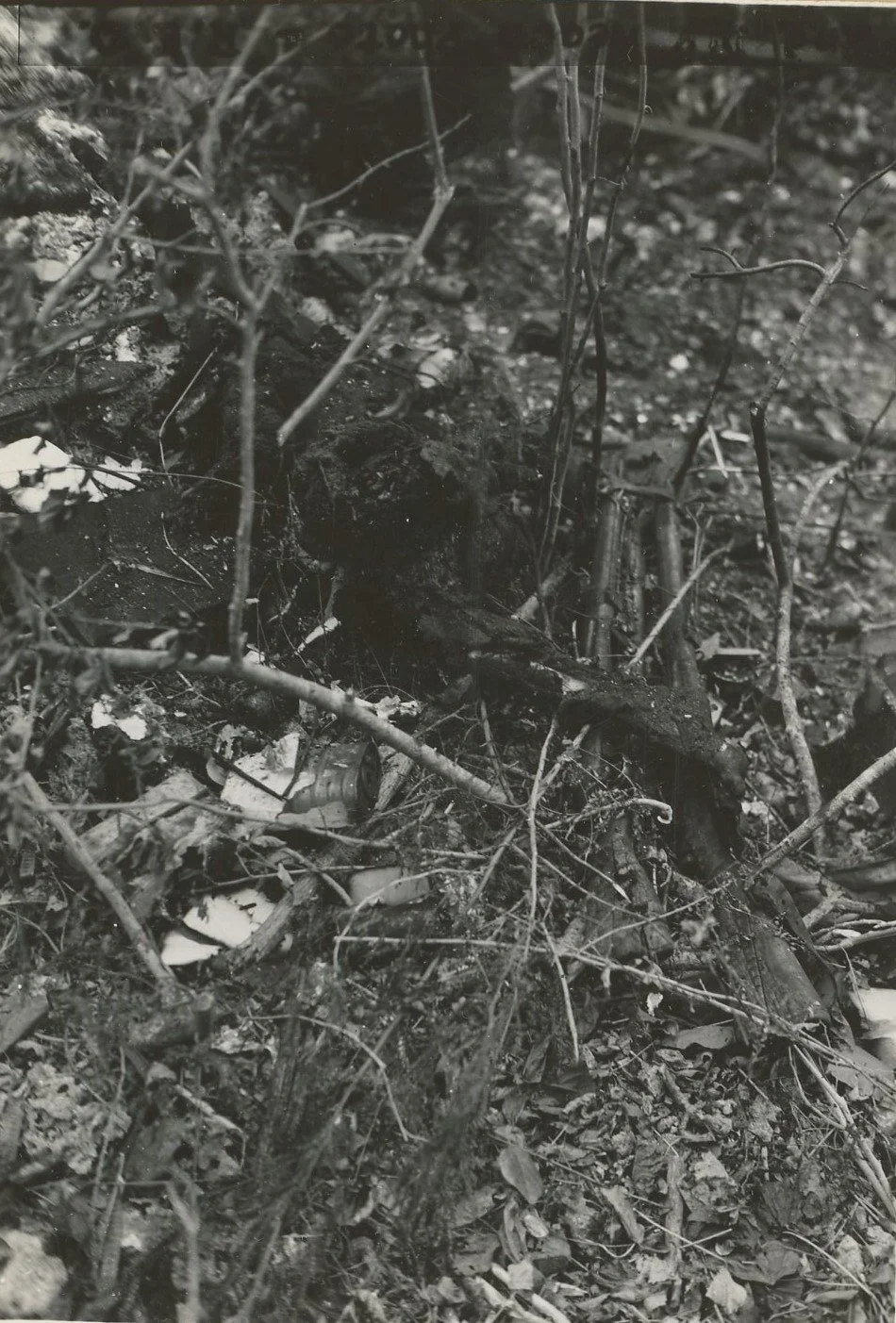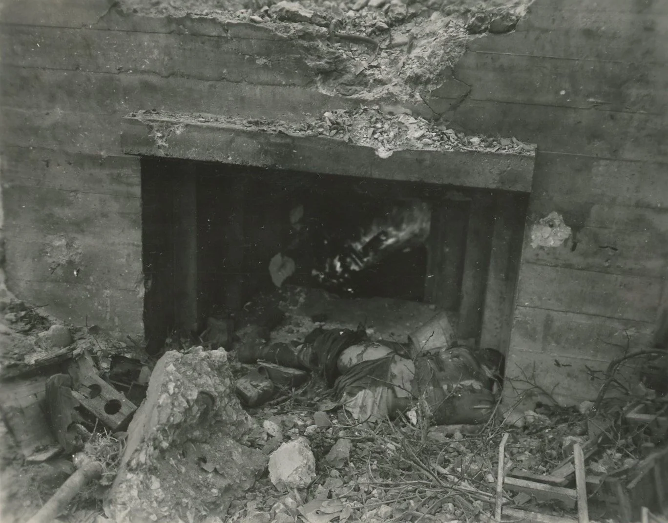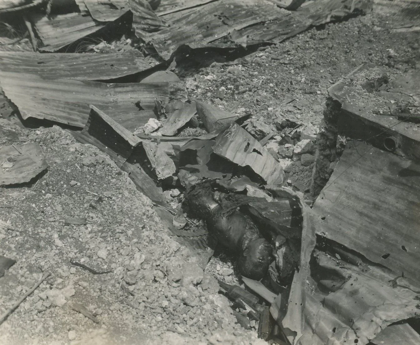 The charred leg remains of a Japanese soldier rest atop a tank of the Imperial Japanese Army’s 9th Tank Regiment, 3rd Company. The remainder of his body is visible to the left of the frame.