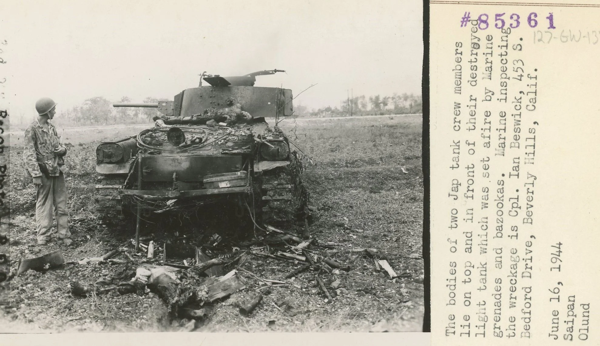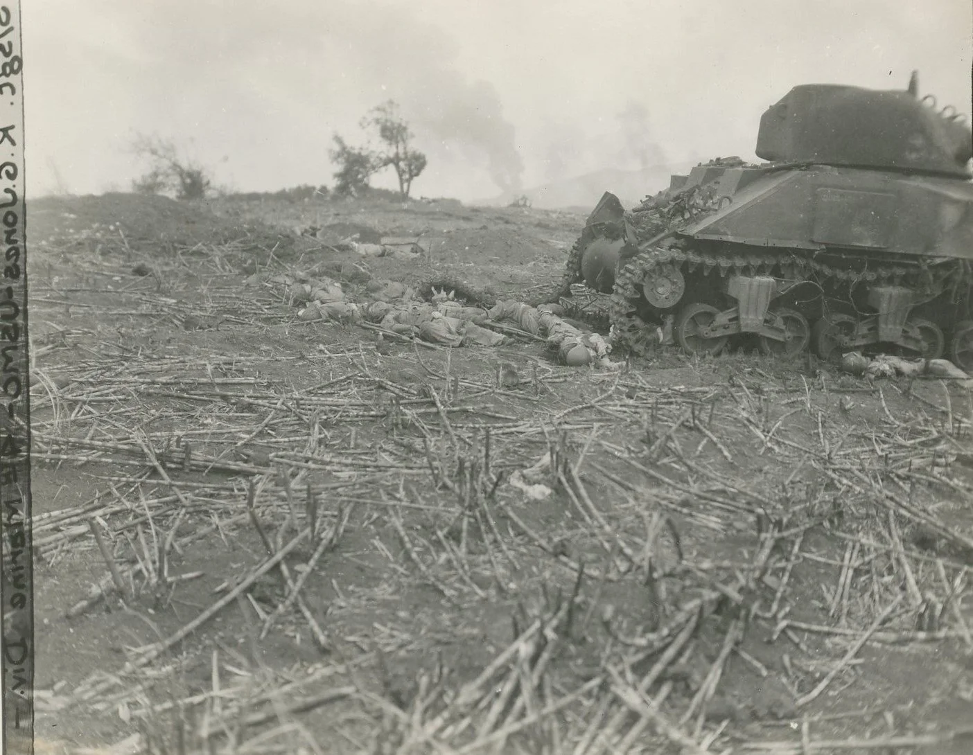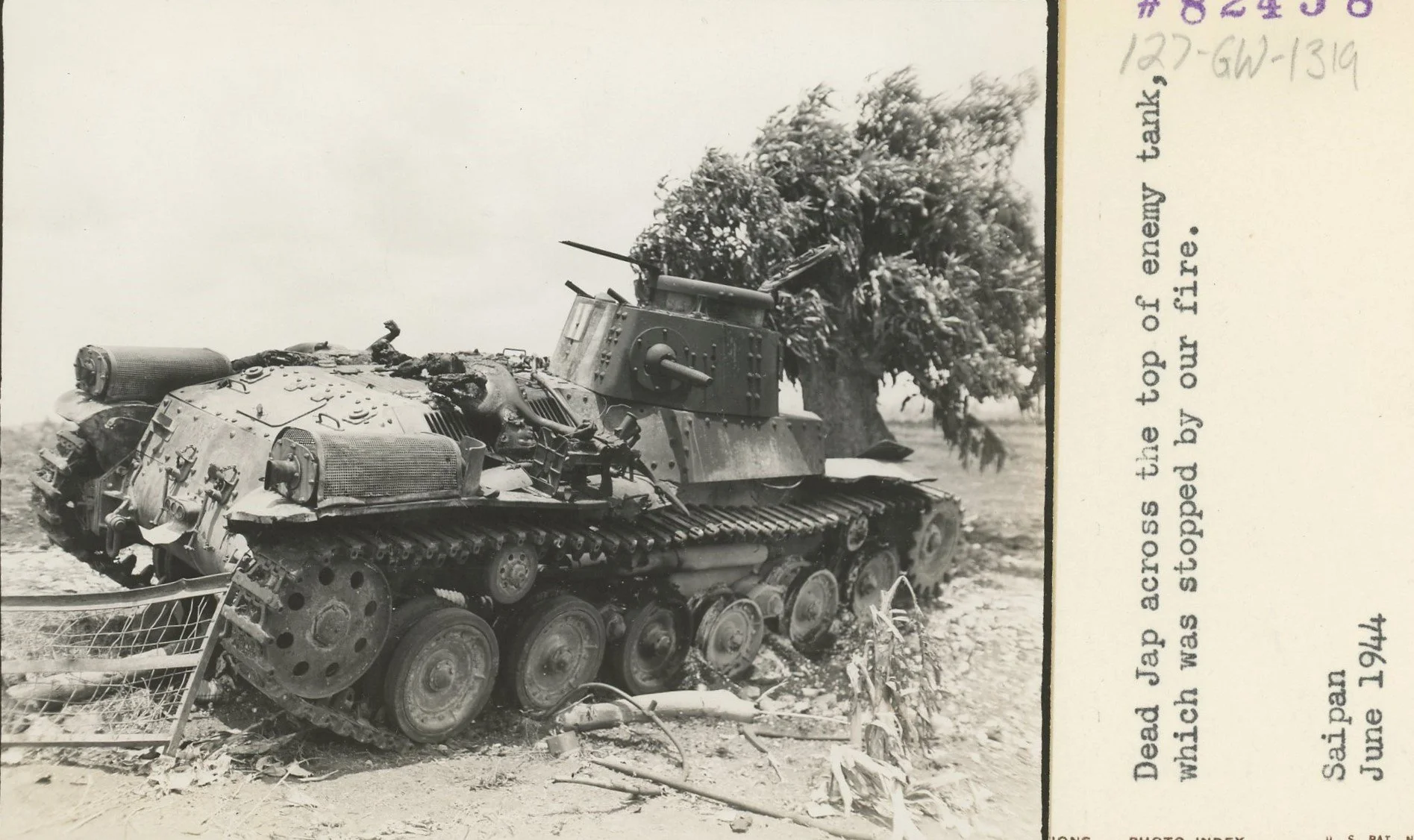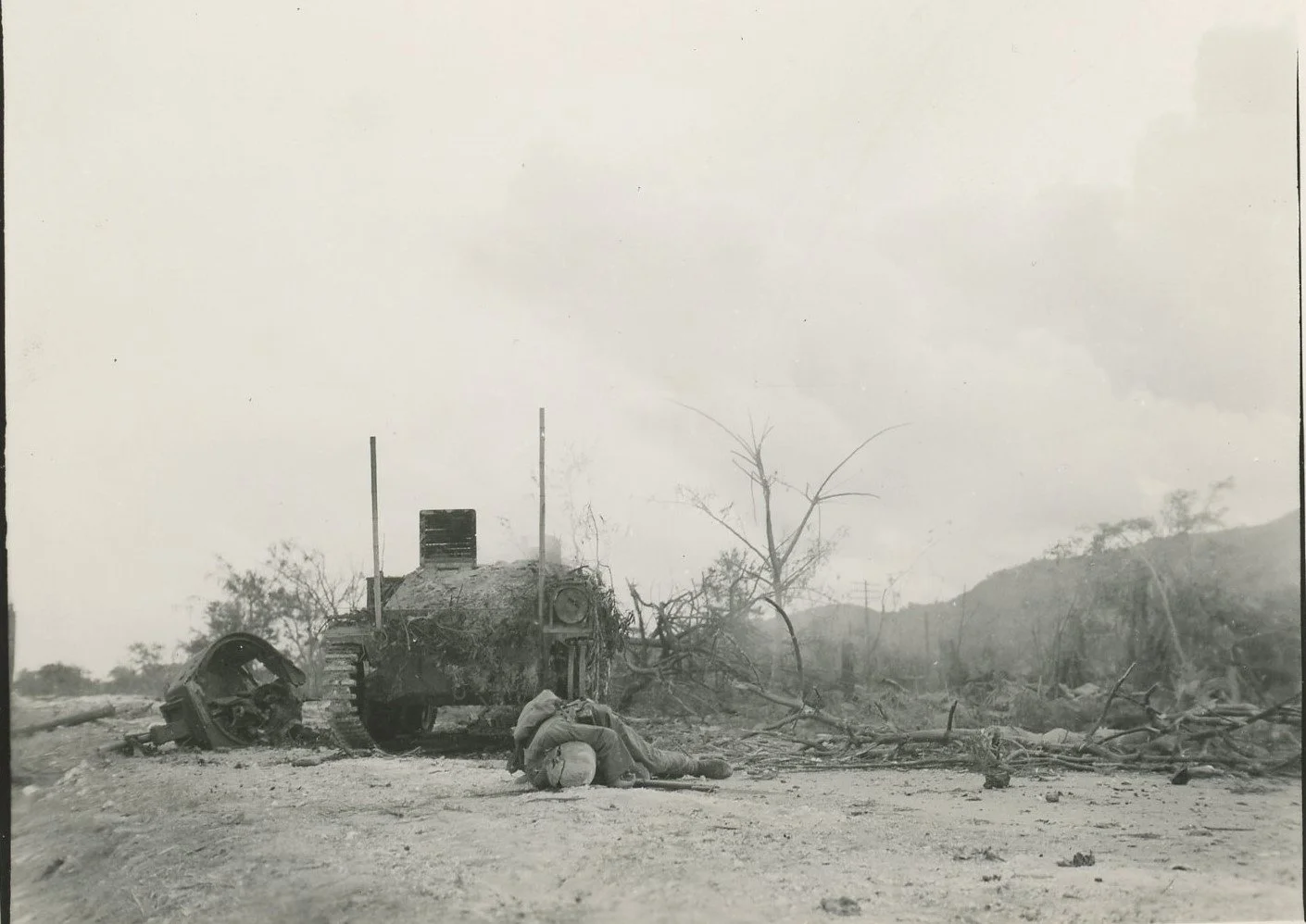 The scorched remains of a Japanese Army soldier lie atop a Type 97 Shinhoto medium tank, the “Donriu,” the command tank of the Imperial Japanese Army’s 9th Tank Regiment, 4th Company.
