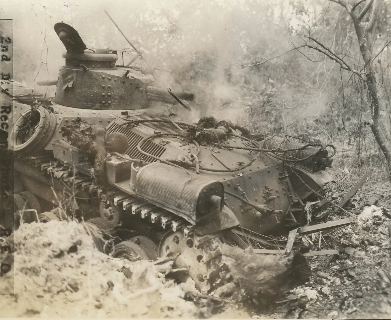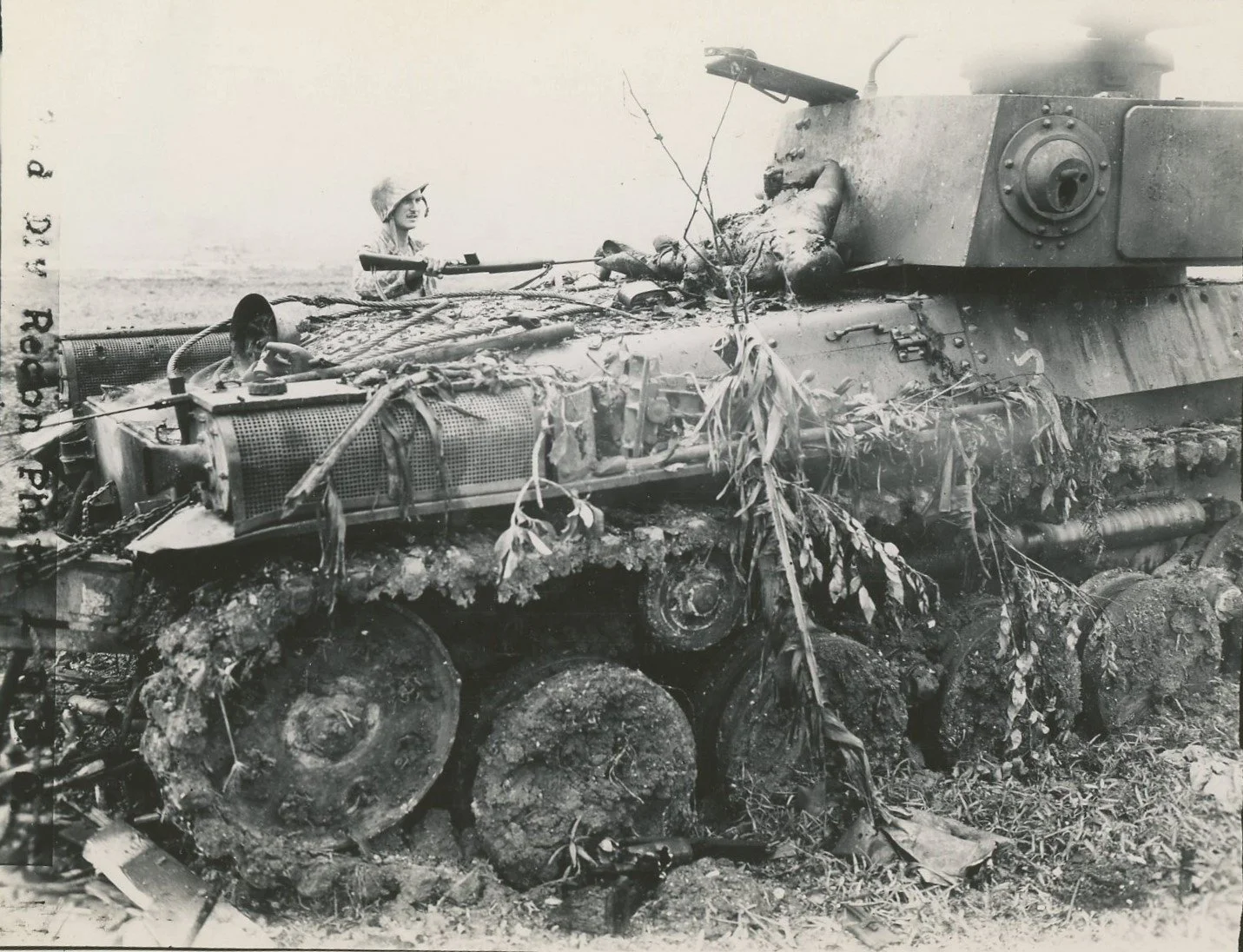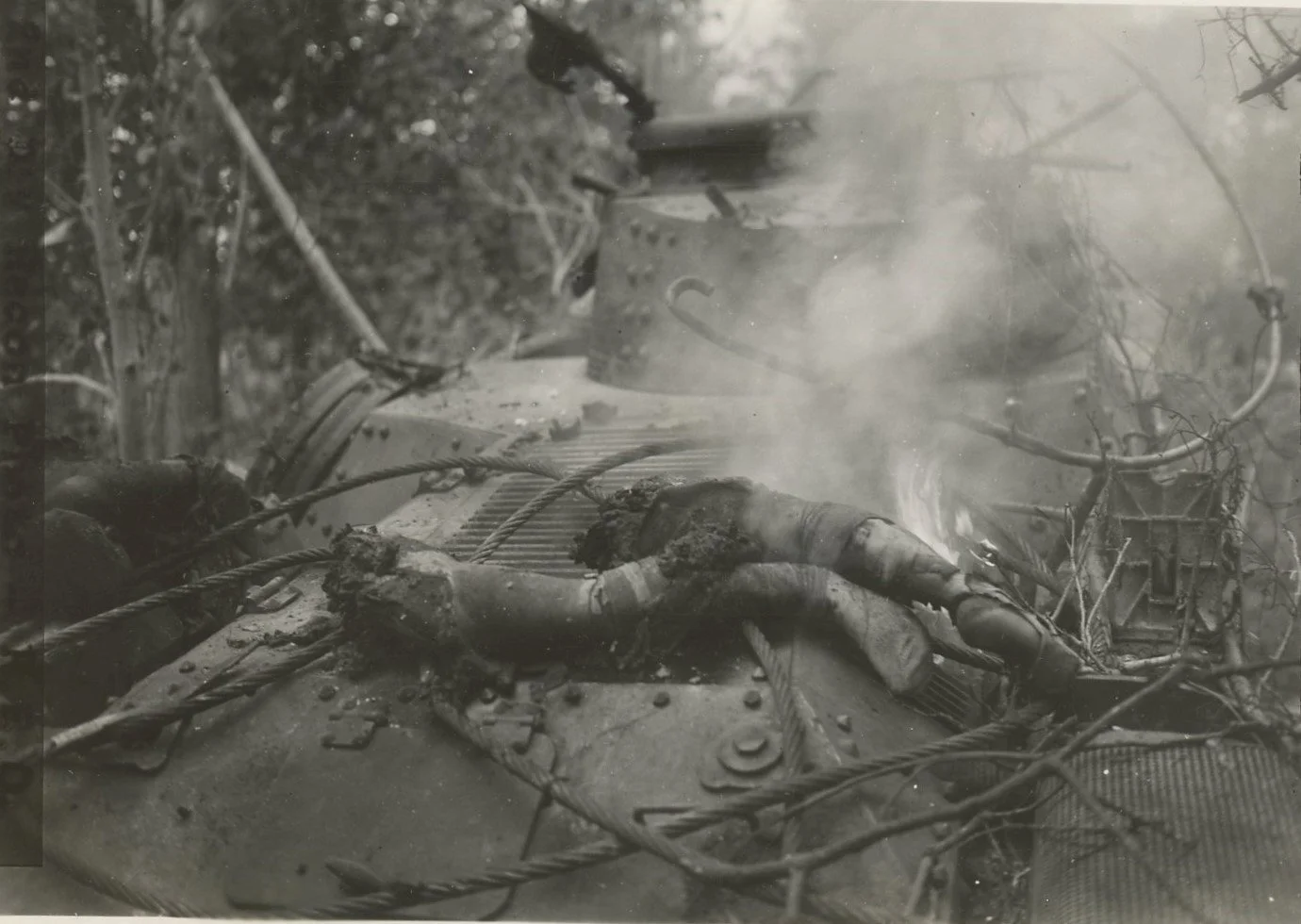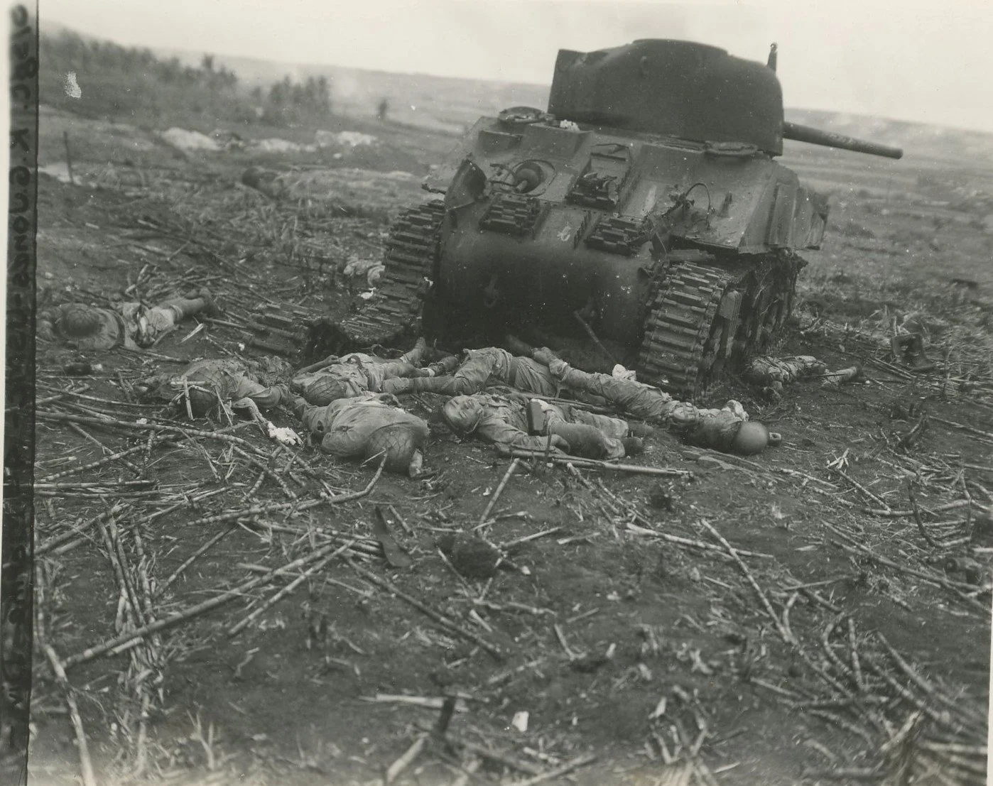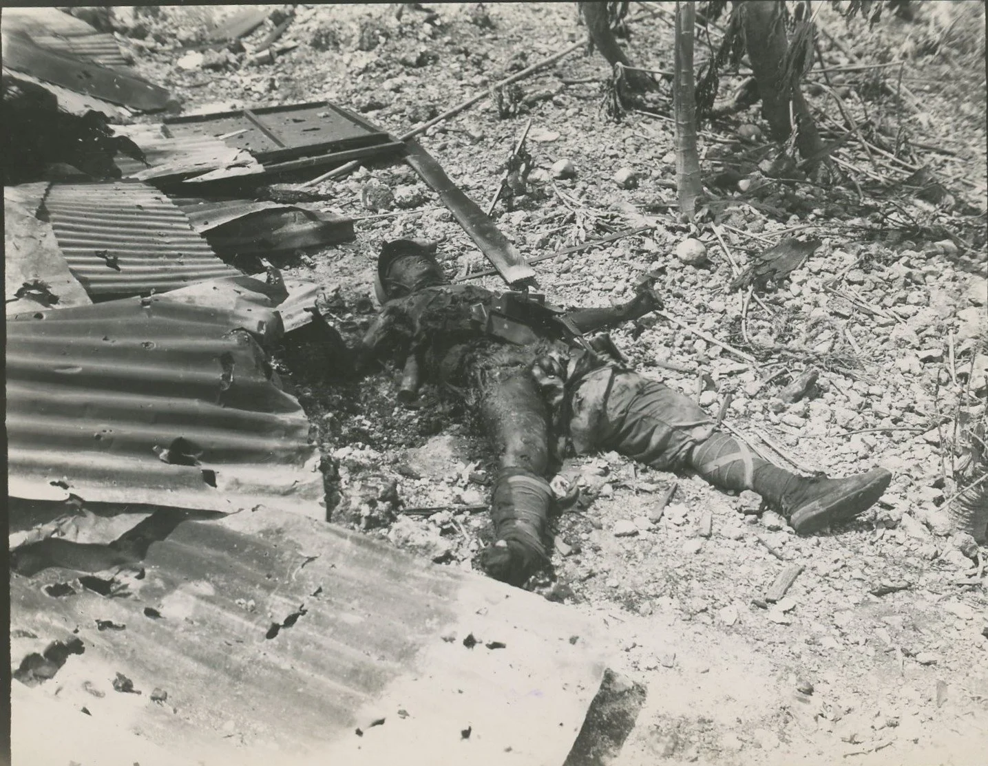 The scorched remains of a Japanese Army soldier lie atop a Type 97 Shinhoto medium tank, the “Donriu,” the command tank of the Imperial Japanese Army’s 9th Tank Regiment, 4th Company.