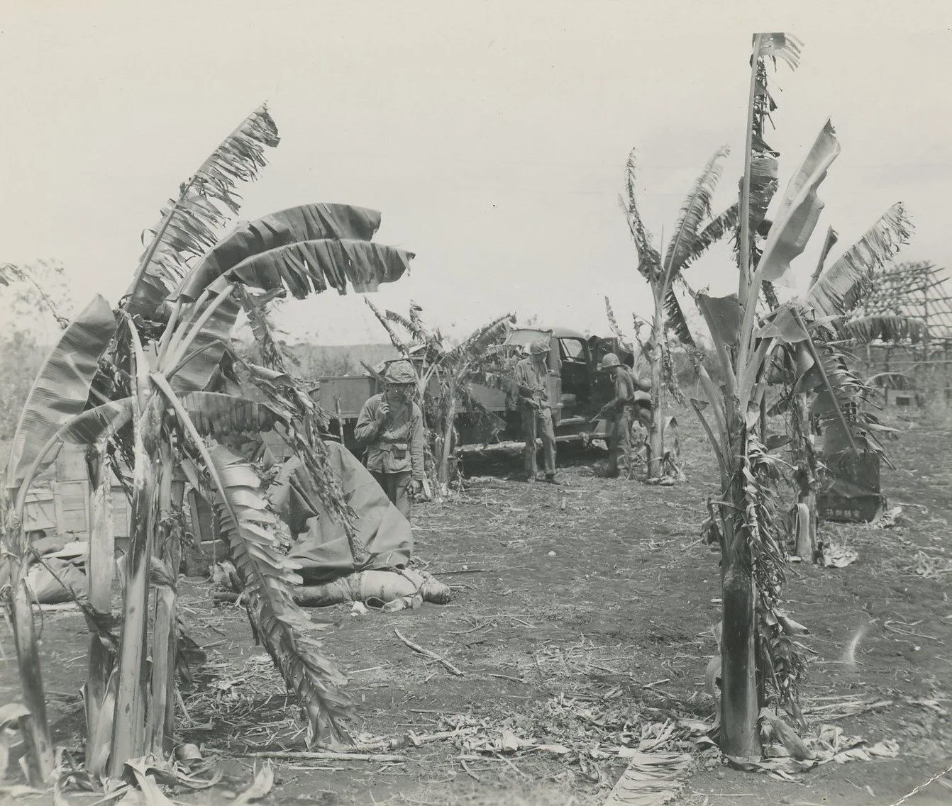 Multiple Japanese soldiers are visible being moved to burial areas.