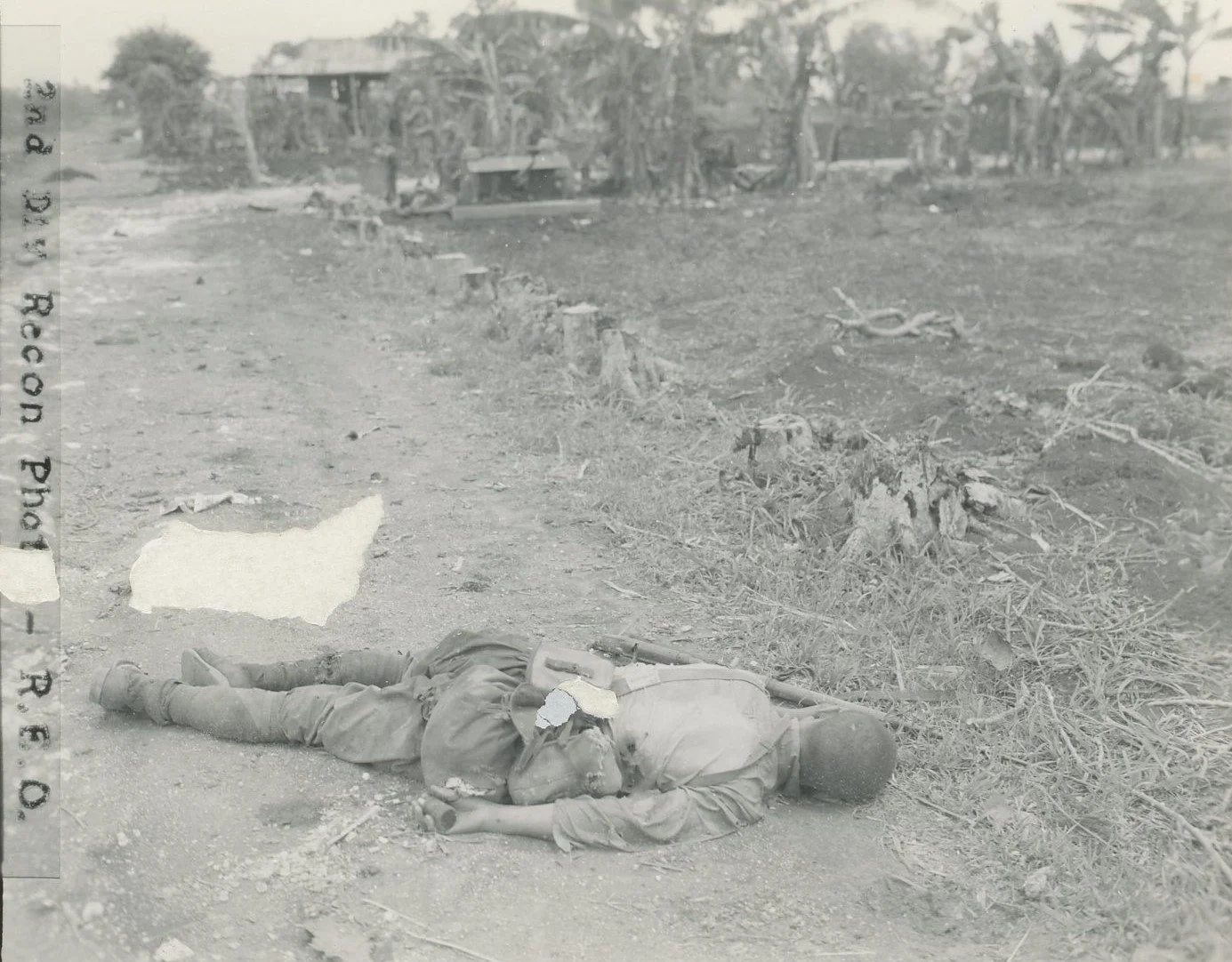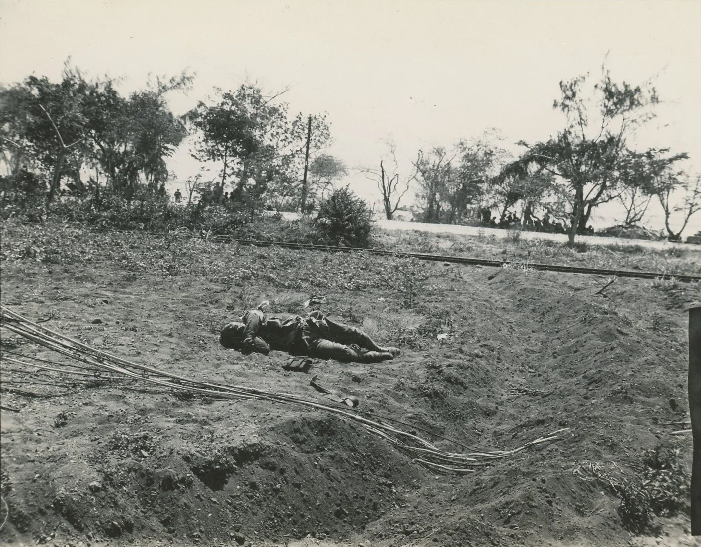 Imperial Japanese Army Type 96/99 light machine gunner lying beside a road, killed during combat.