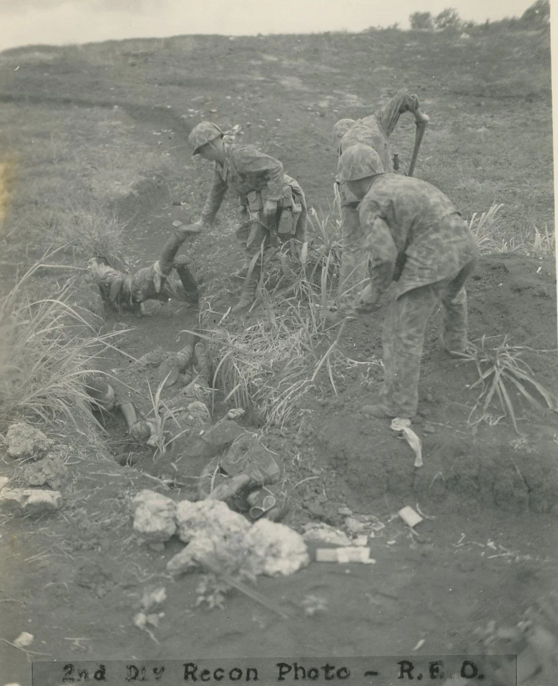 A Japanese solider is drug to an improvised burial hole, Tanapag.