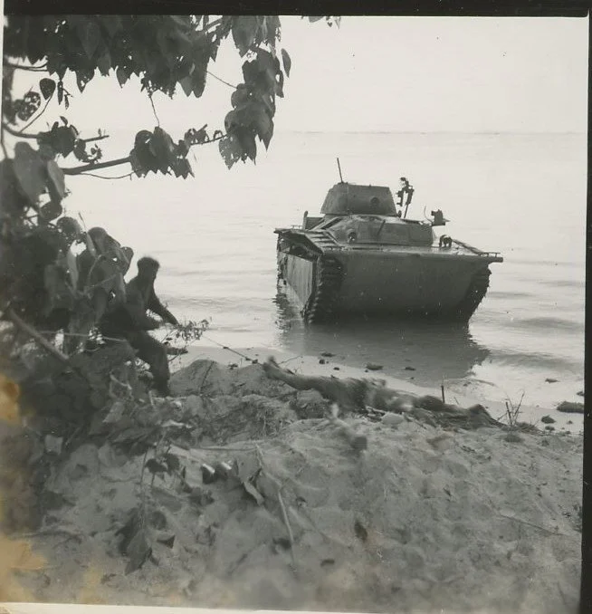 An officer of the Imperial Japanese Army lies in the foreground of a Type 97 Chi-Ha medium tank of the 9th Tank Regiment, possibly of the 3rd Company.